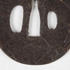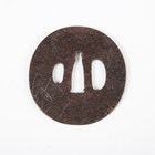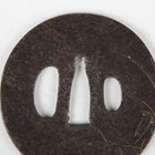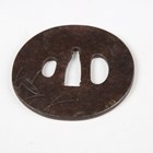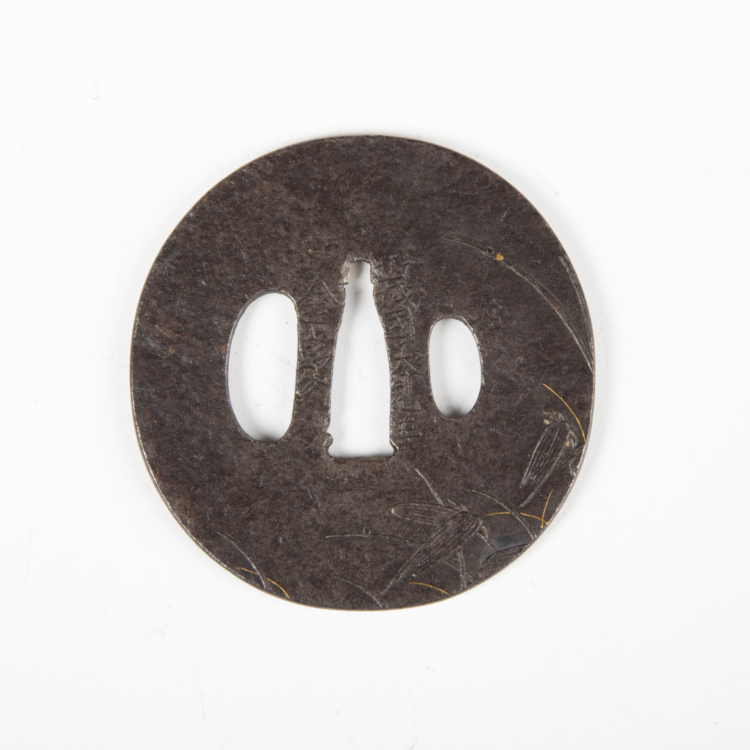A fine Japanese circular iron and shakudo-inlaid steel sukashi tsuba, Edo period, decorated with reeds and possibly water chestnuts over a hammered finish ground, signed, 7.5cm x 8cm. Provenance: the collection of the late Roald Knutsen (1933-2025). Note: Roald and Patricia Knutsen identified the signature as Kane-Ie and Yamashiro-No-Kuni Ju, who worked in Fushimi, Kyoto, around the 17th century.