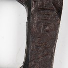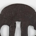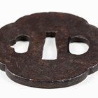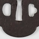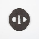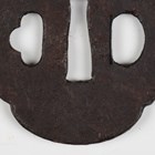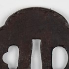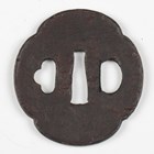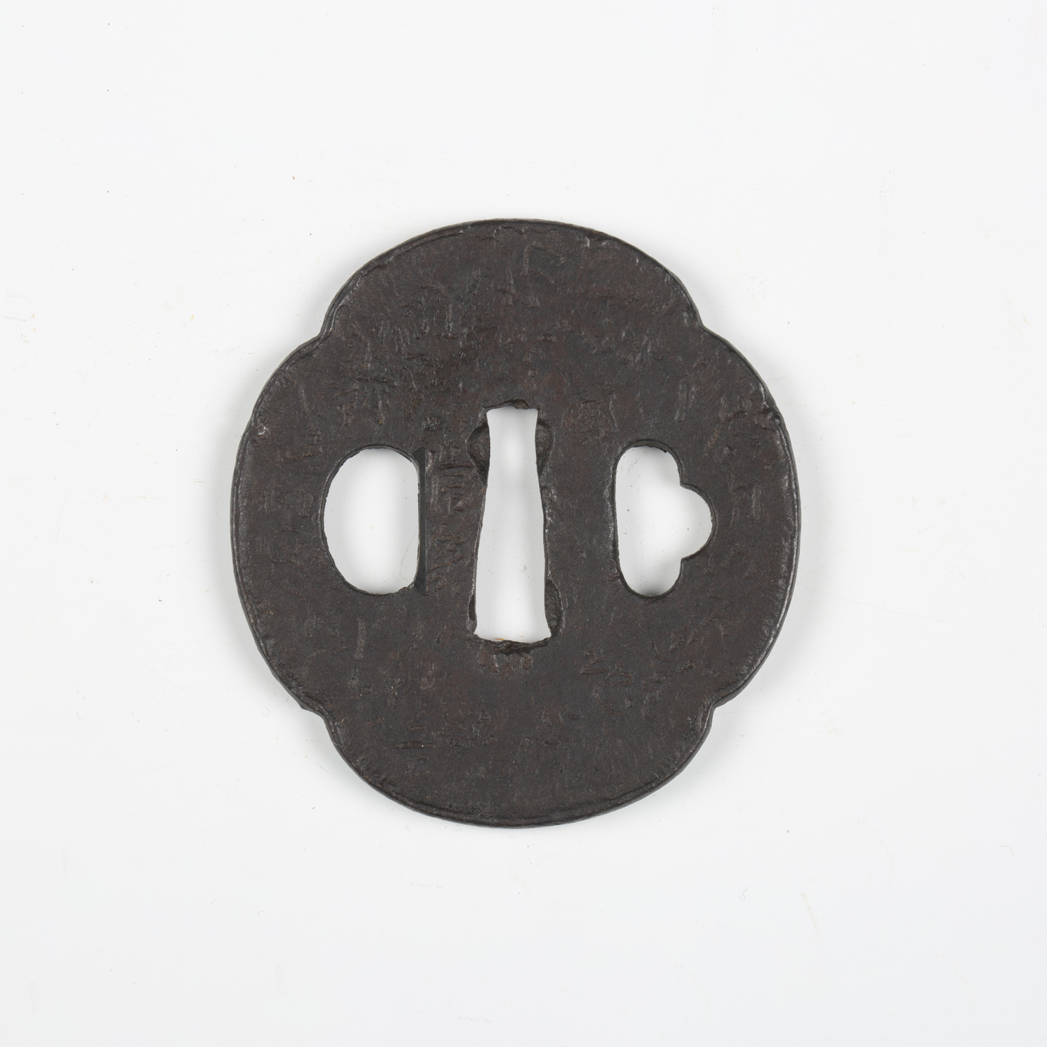A Japanese shaped oval iron sukashi tsuba, probably late Muromachi period, with design to field of a famous warrior’s maxim ‘In Movement Quietness, In Quietness Movement’, signed, 7cm x 7.5cm. Provenance: the collection of the late Roald Knutsen (1933-2025). Note: Roald and Patricia Knutsen identified the signature as Nobuie of Myochin-Ryu, probably first half 16th century.