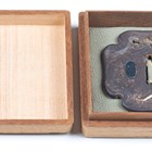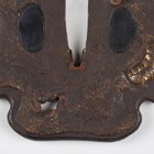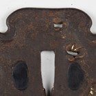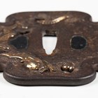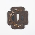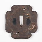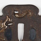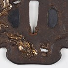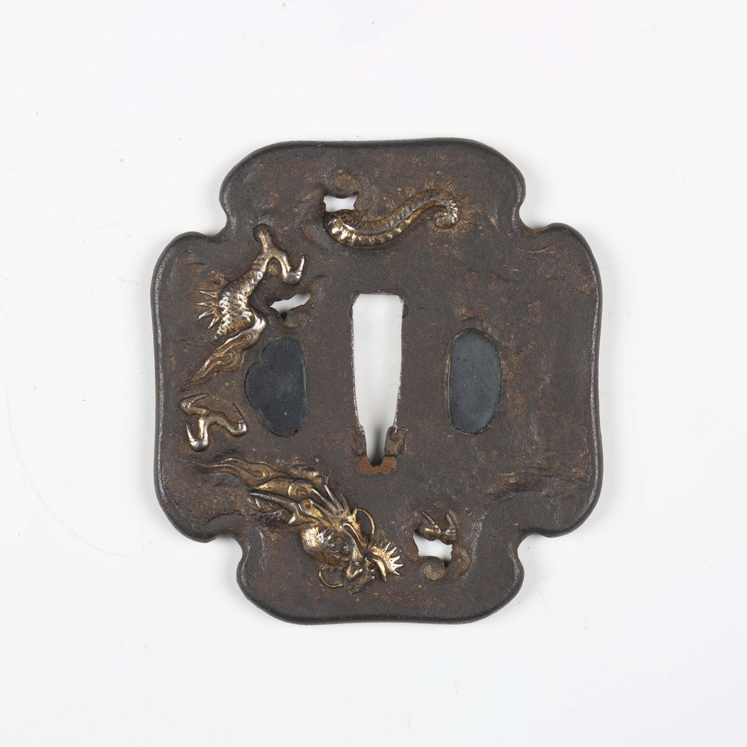 A Japanese iron tsuba, Edo period, of shaped square lobed form, damascened with a dragon three-dimensionally clawing its way around the outer edge, as if appearing to tear through clouds, unsigned, 7.5cm x 8.5cm, within a later presentation box. Provenance: the collection of the late Roald Knutsen (1933-2025).