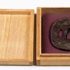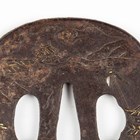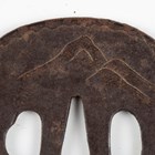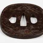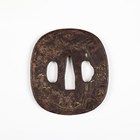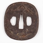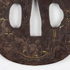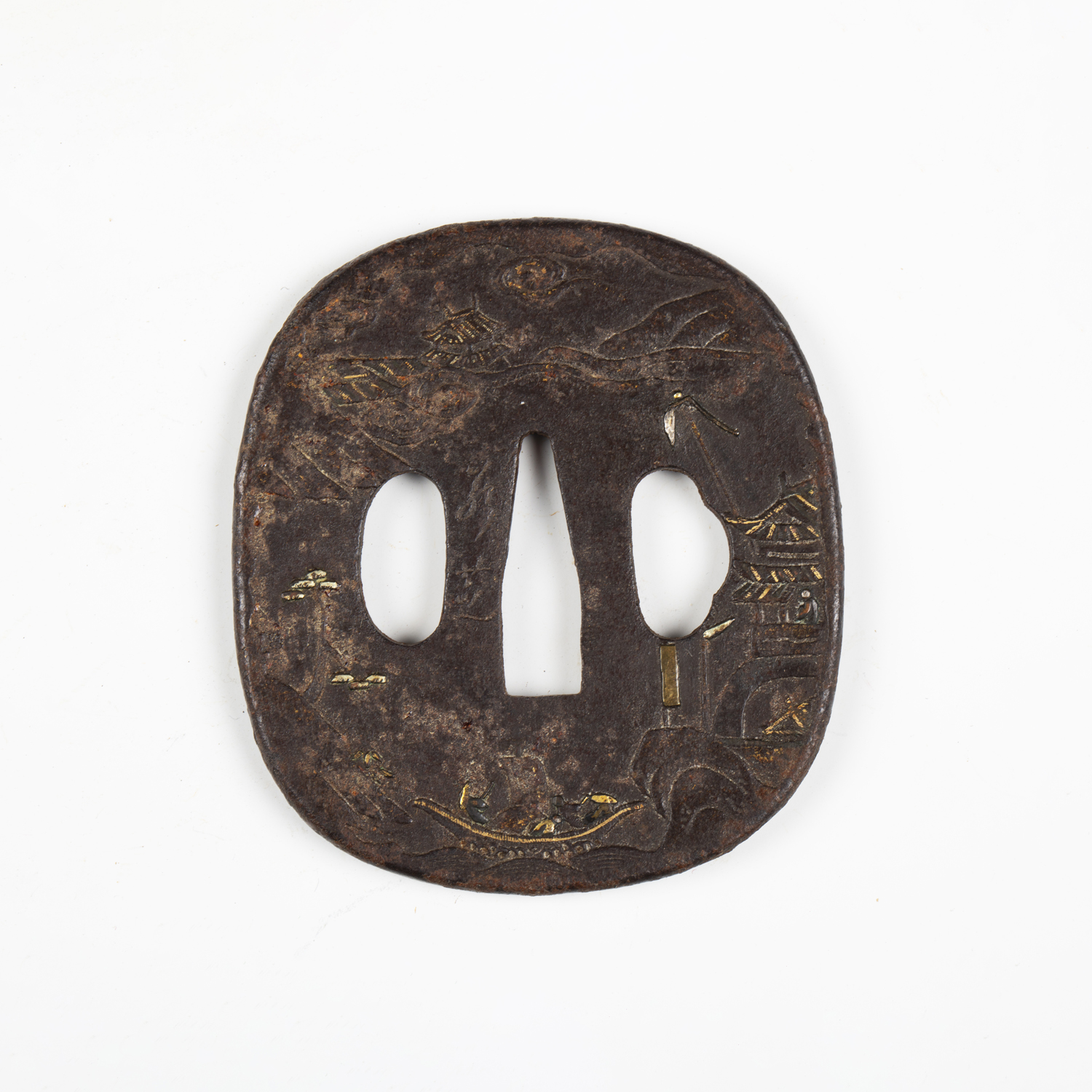 A Japanese iron tsuba, Edo period, of oval form, damascened to both sides with junks and vignettes detailed with houses and pagodas in a mountain landscape, signed to centre, 6.5cm x 7.2cm, within a later presentation box. Provenance: the collection of the late Roald Knutsen (1933-2025).