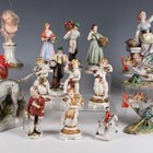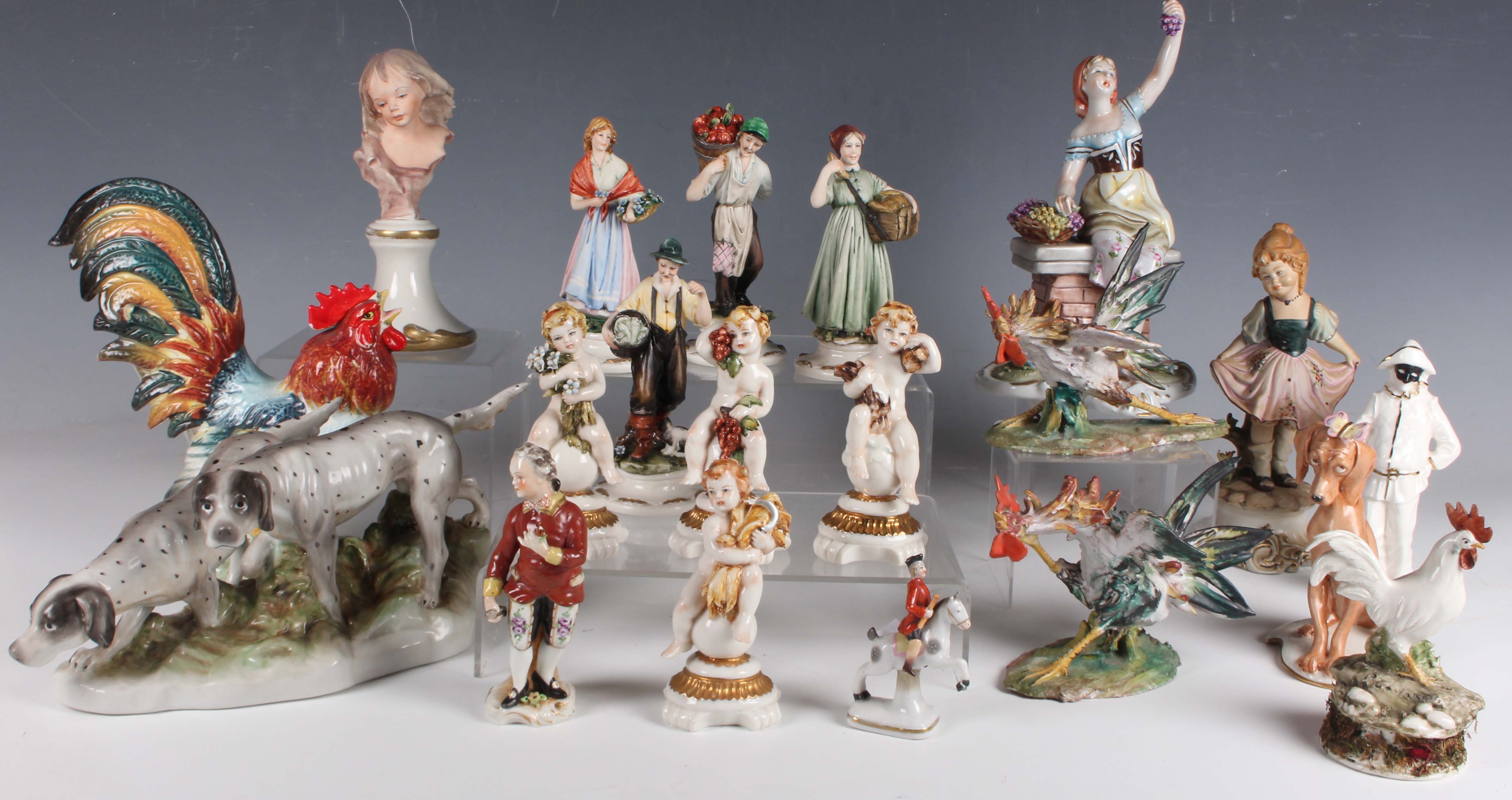 A group of Continental porcelain figures and animals, mostly Italian Capodimonte, 20th century, including a set of four putti representing the seasons, height 11cm, a set of four street vendor figures, height 13cm, a girl grape harvester seated on a wall, height 22cm, four different cockerels and a group of two hunting dogs, length 25cm (some faults).
