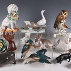 A group of British and Continental pottery and porcelain animal and bird models, late 19th and 20th century, including a Royal Copenhagen group of two tethered geese, circa 1990, model No. 609, designed by Ingeborg Nielsen, a Copenhagen model of a fawn, three models by Karl Ens, two Royal Dux piglets, a Royal Doulton poodle, HN2631, and a Volkstedt ostrich, height 18cm (minor faults).