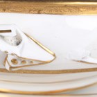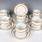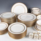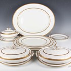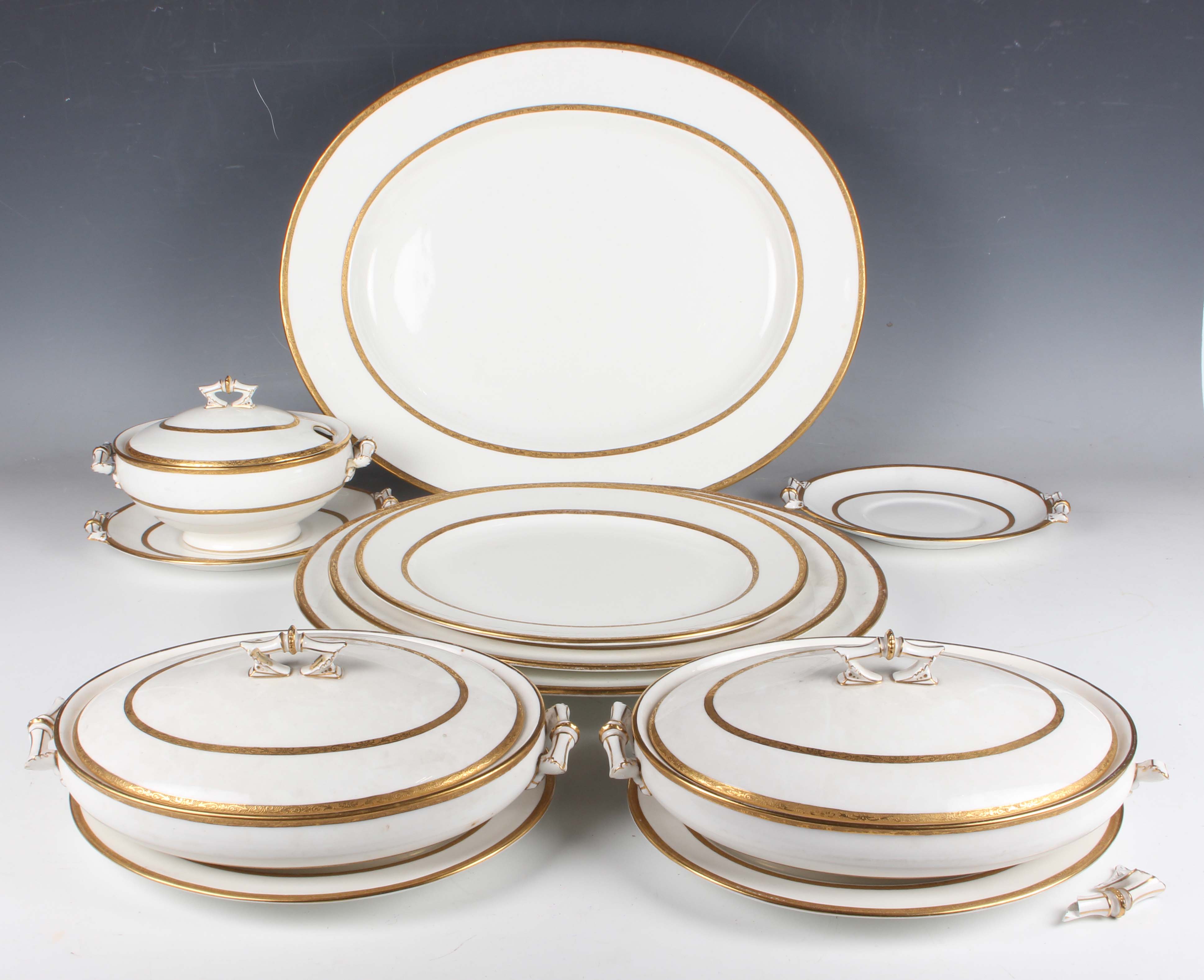 A Royal Crown Derby white glazed gilt banded part service, 1930s, comprising twelve dinner plates, 26.8cm diameter, twelve dessert plates, 21.2cm diameter, six graduated oval platters in five sizes, sixteen salad plates, 23.5cm diameter, ten tea plates, diameter 18.2cm, four two-handled soup bowls and nine stands, four teacups and six saucers, two breakfast cups and one saucer, two oval vegetable tureens and covers, sauce tureen with cover and two stands, two sugar bowls, two circular butter dishes and five egg cups (some faults and repairs).