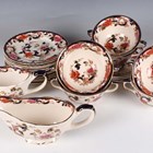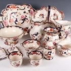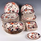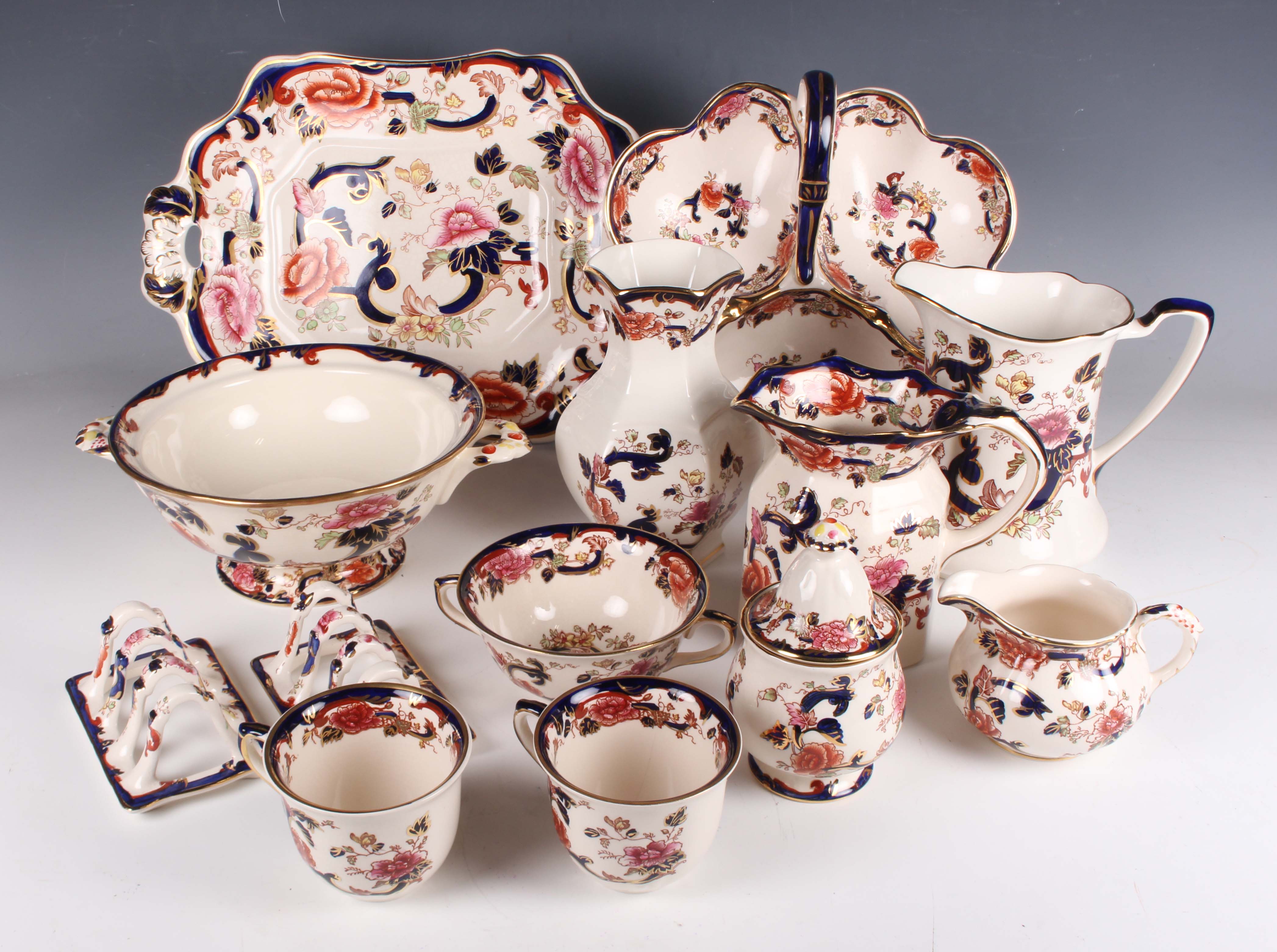 A Mason's Mandalay pattern part service, comprising twelve dinner plates, diameter 26.5cm, eleven dessert plates, diameter 23cm, eleven tea plates, diameter 17.3cm, soup tureen stand, footed bowl, single-handled trefoil shaped dish, ten dessert bowls, four oval dishes, seven two-handled soup bowls and three stands, two sauce boats, two teacups, three small square dishes, three jugs, a vase, height 18cm, two toast racks, small oval dish and a preserve pot and cover (minor faults).
