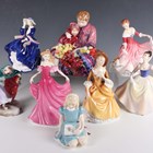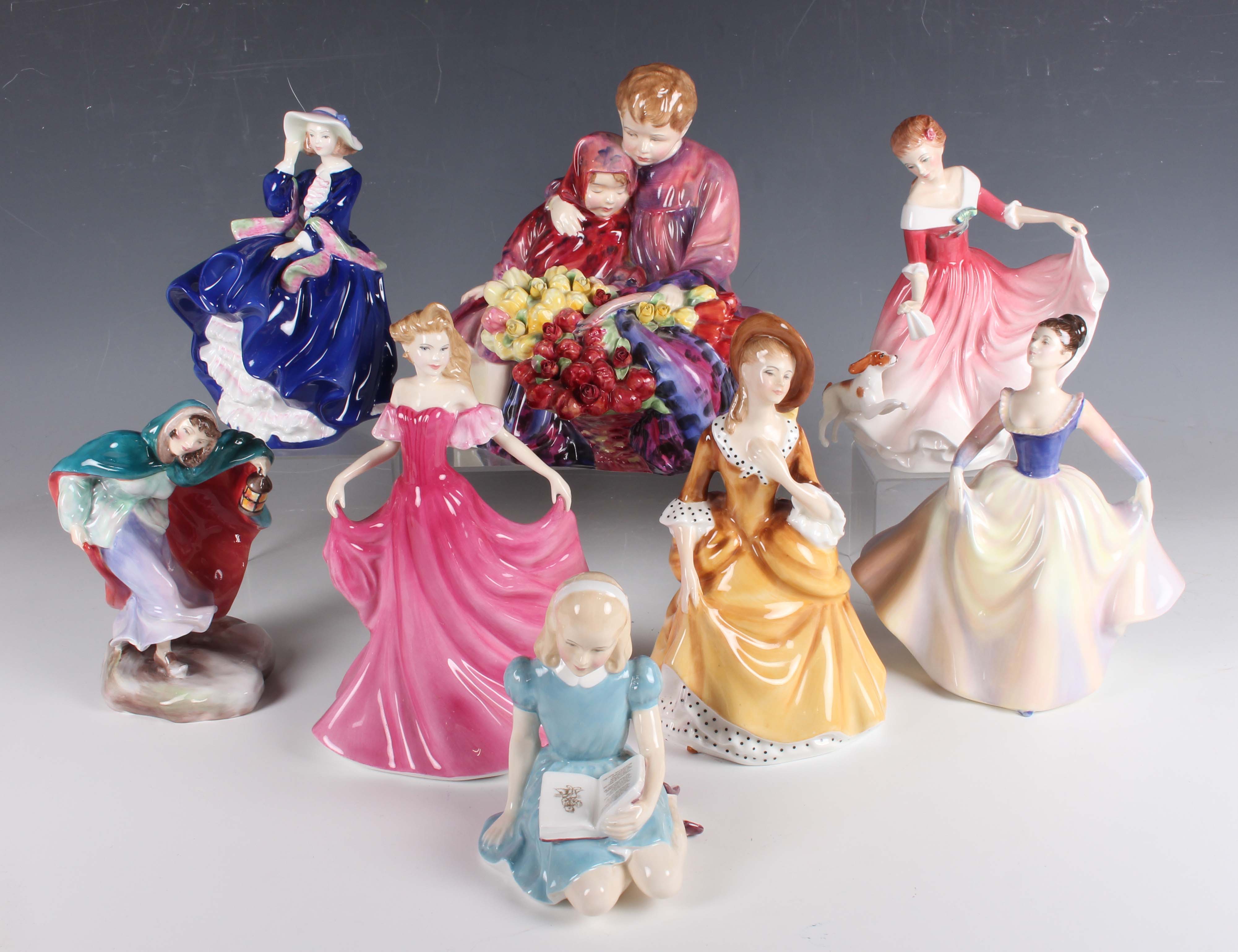 Eight Royal Doulton figures, comprising Flower Seller's Children, HN1342, Alice, HN2158, limited edition Top o' the Hill, HN3735, signed to base and boxed with certificate, Winter, HN2088, My Best Friend, HN3011, Sandra, HN2275, Emma, HN3714, and Lisa, HN2394.