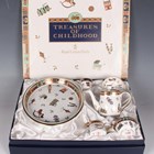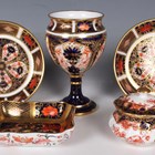 A Royal Crown Derby Treasures of Childhood miniature six piece tea service, dated 2003, boxed, together with a small group of Royal Crown Derby Japan pattern wares, comprising two 1128 pattern circular dishes, dated 1980, diameter 11cm, a matching rectangular pin dish, dated 1972, a footed goblet, early 20th century, height 11.3cm, and a circular pot and cover (small chip).