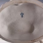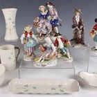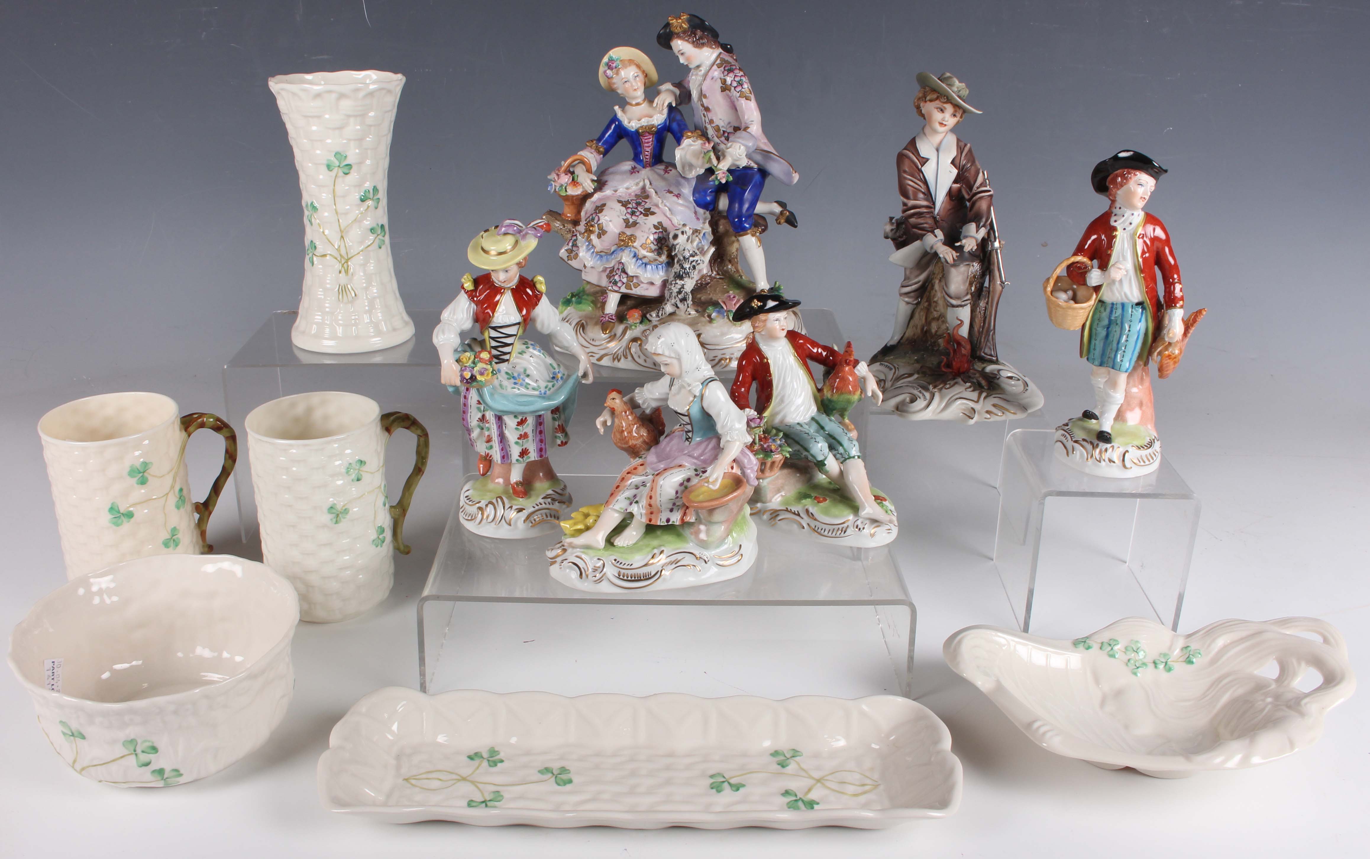 A Sitzendorf porcelain figure group, 20th century, modelled as a couple in period dress accompanied by a dog, raised on a base with gilt enriched scroll moulded detail, underglaze blue factory mark to base, height 17cm, two pairs of Dresden figures, tallest 15cm, a Capodimonte figure of a hunter warming his hands over a fire, and six pieces of modern Belleek, including two basketweave moulded mugs decorated with shamrocks and a dressing table tray moulded with the head of an Art Nouveau lady.