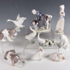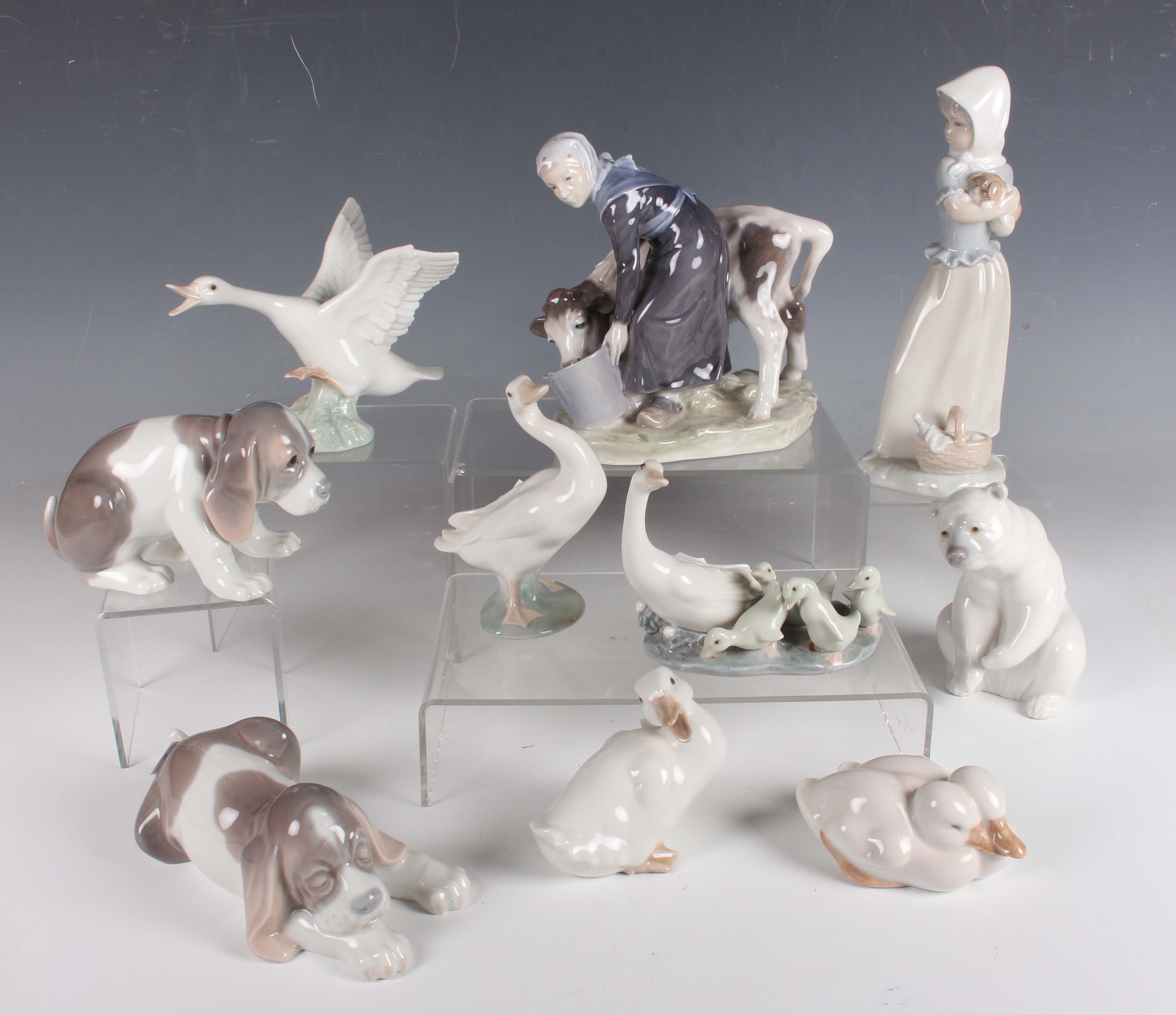 A Royal Copenhagen figure group of a girl feeding a calf, dated 1967, designed by Christian Thomsen, model No. 779, height 15cm, a Royal Copenhagen group of two ducks, model No. 516, six Lladro models, comprising two puppies, a polar bear and three geese, and two Nao ornaments.