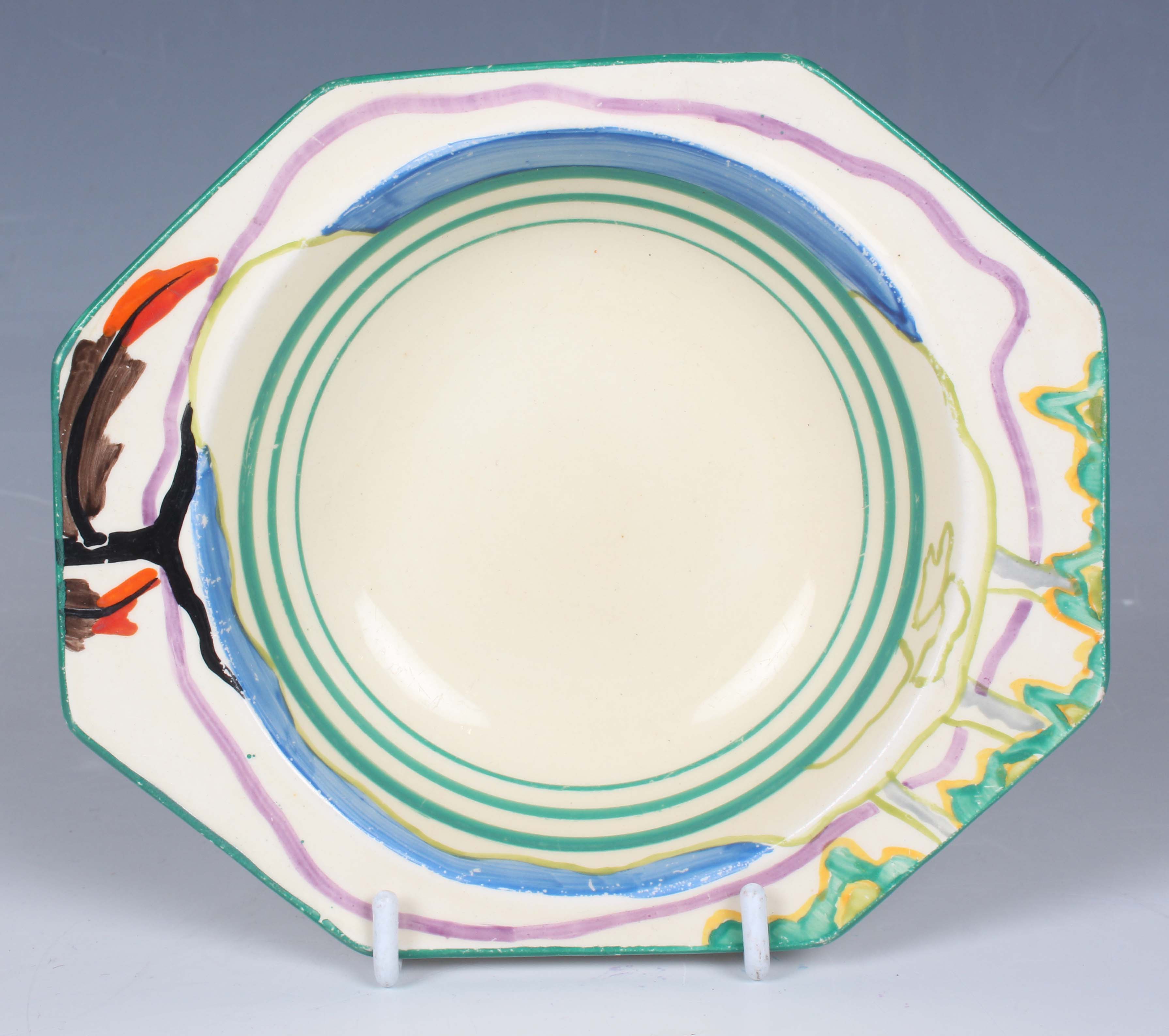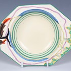 An Art Deco Clarice Cliff Fantasque Coastal Oak pattern bowl, 1930s, of circular shape with octagonal rim, impressed and black printed marks to base, length 15.7cm.