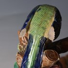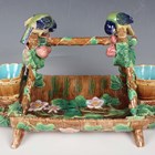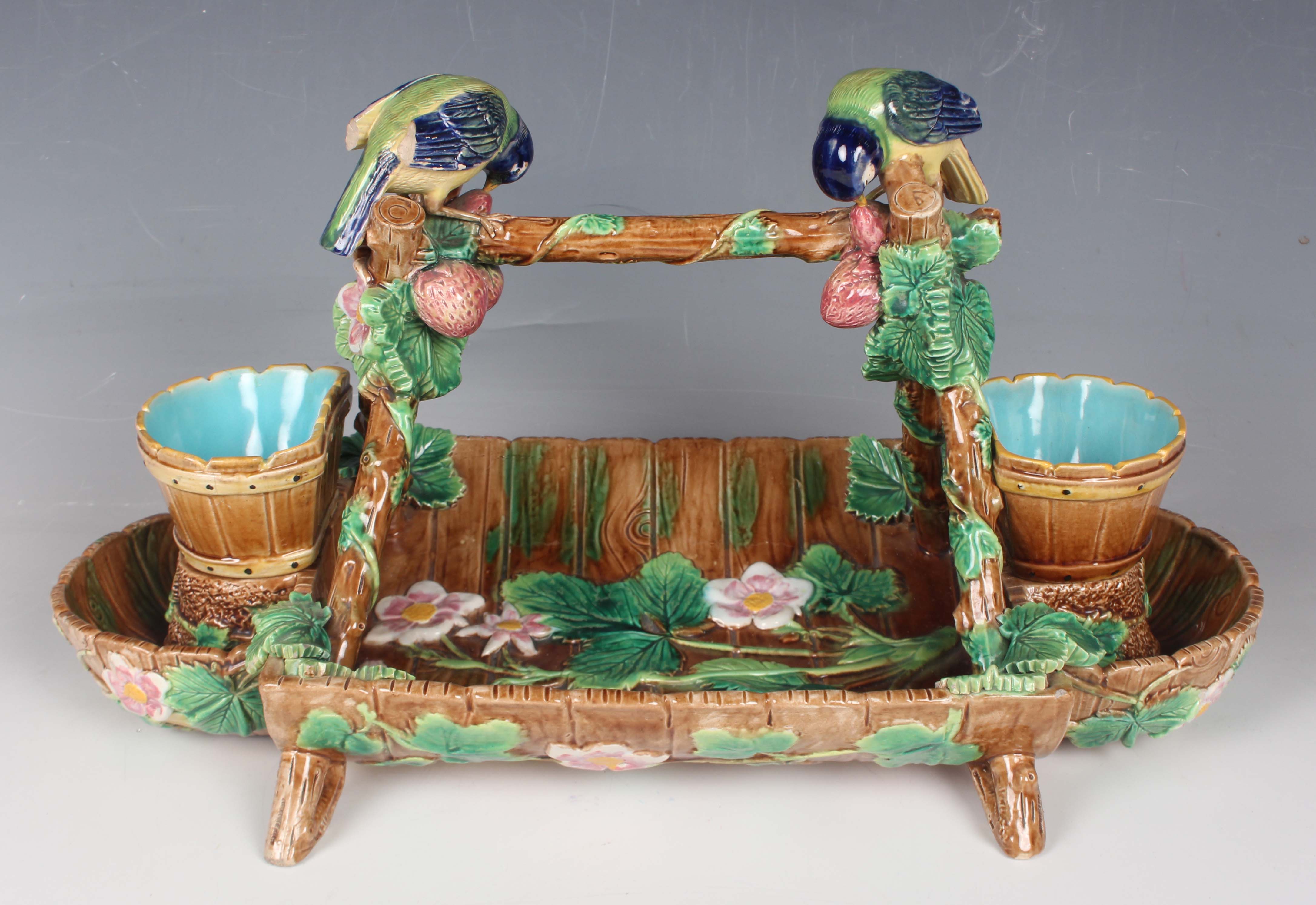 A George Jones majolica strawberry server, circa 1875, modelled as a wooden trug with removable sugar and cream holders to each end, the handle formed from moulded branches entwined with strawberry leaves and fruits being pecked at by two blue tits, model No. 3423, impressed monogram mark to base and moulded diamond registration lozenge, height 20cm, length 36cm (some faults).