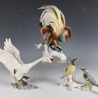 A Karl Ens model of a bird of paradise, raised on a white glazed branch base, height 30cm, together with a Karl Ens group of two wagtails, height 14cm, and a Hutschenreuther model of a swan, height 23cm (minor faults).