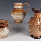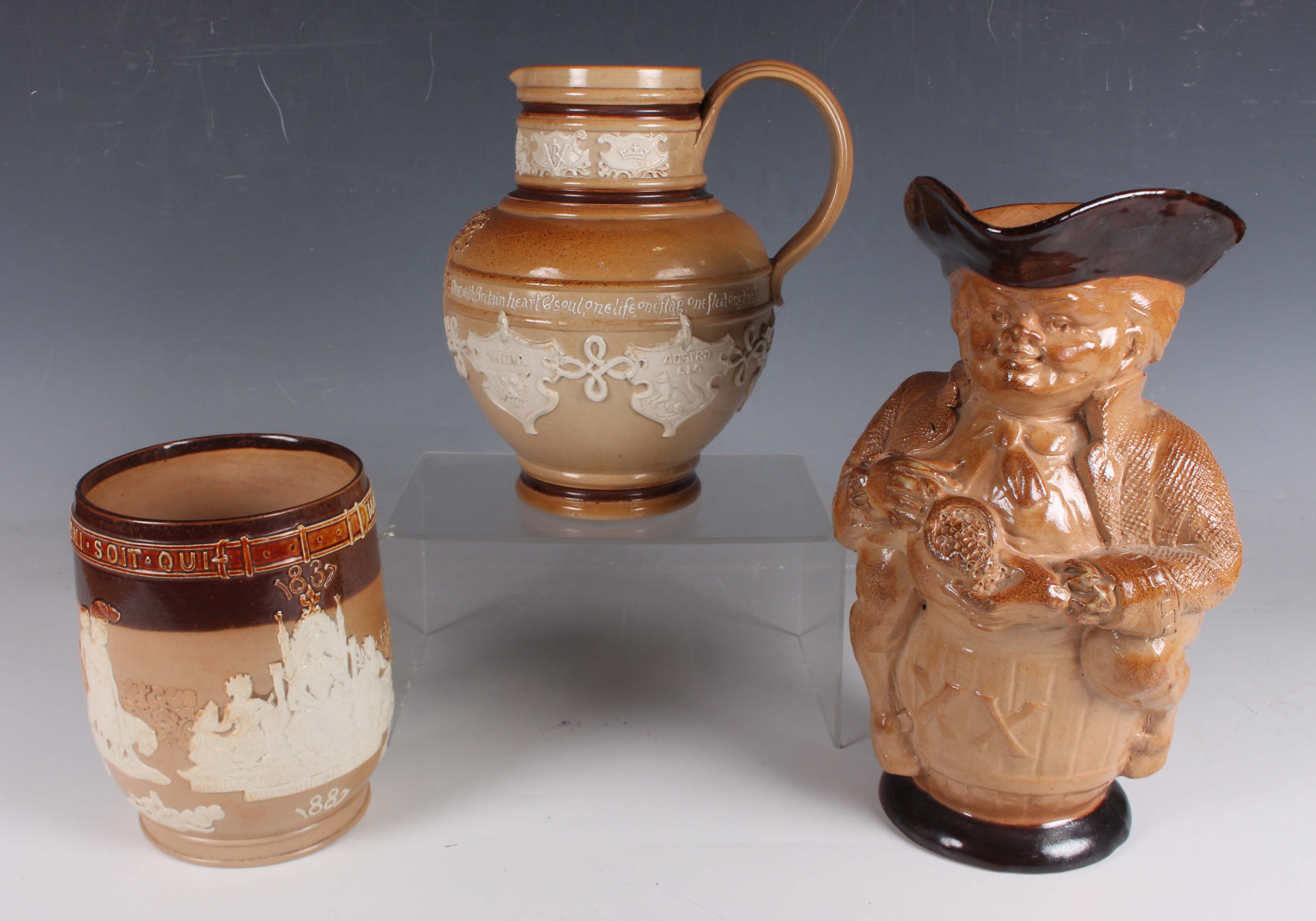 A large Doulton Lambeth stoneware Toby jug, designed by Harry Simeon, modelled as a gentleman seated on a barrel detailed 'XX', holding an overflowing tankard, impressed factory marks with registration number 169753 to base, height 26cm, together with two Doulton Lambeth stoneware Queen Victoria commemoratives, the first a tankard celebrating her Golden Jubilee, sprigged with figures representing different parts of the Empire, height 15cm, the second a jug sprigged with panels named with parts of the empire, including New Zealand and Australia, height 19cm.