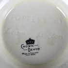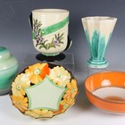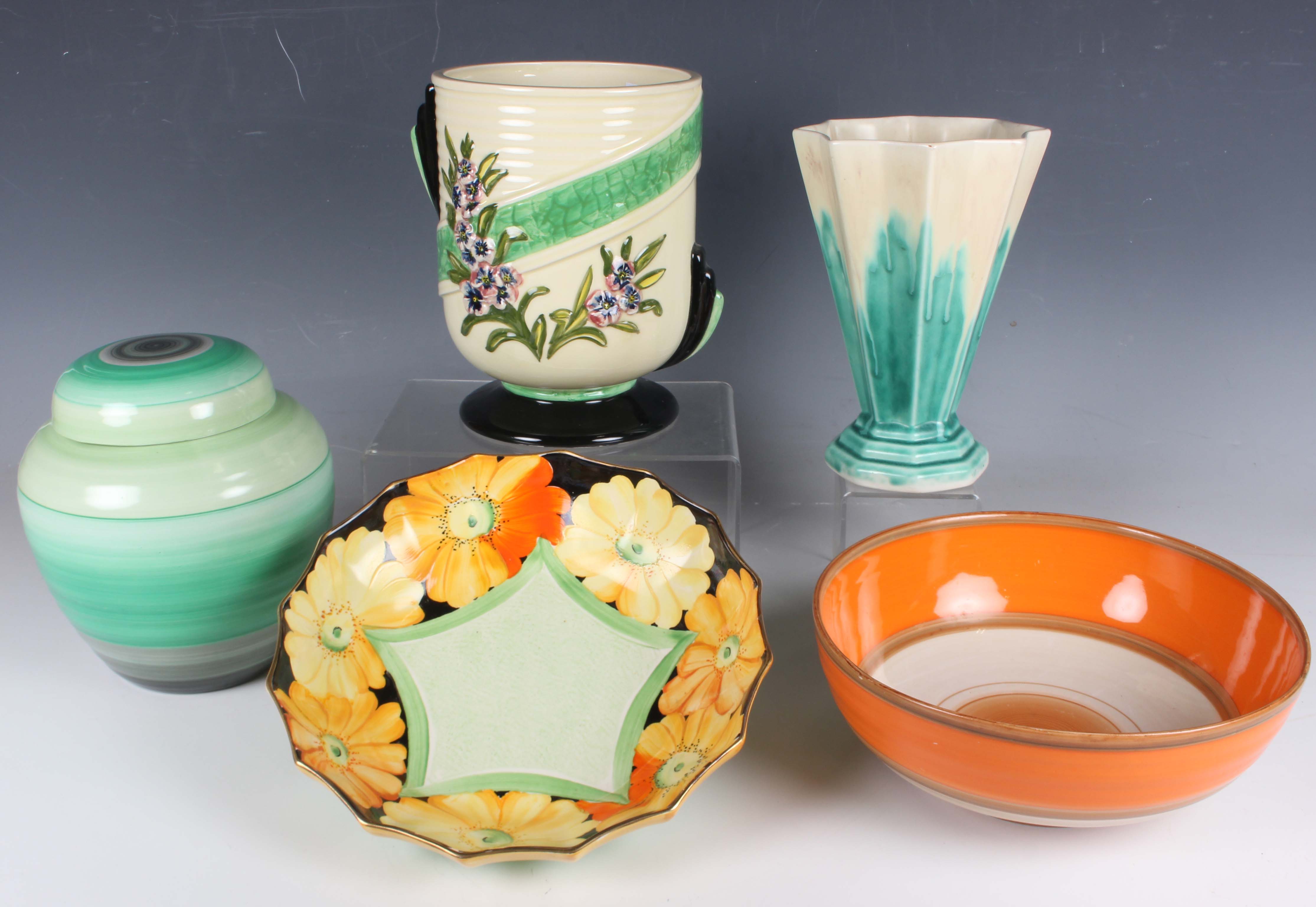 An Art Deco Shelley Harmony green banded ginger jar and cover, 1930s, height 17cm, a similar Shelley orange and brown banded circular bowl, diameter 21.7cm, a Gray's Pottery circular bowl painted with large yellow flowers against a black ground around a central green base interior, diameter 22.8cm, and two Crown Devon Art Deco style vases, both 19cm high.