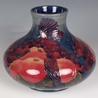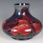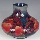A Moorcroft Pottery Finches pattern vase, dated 1995, designed by Sally Tuffin, of bulbous shape, impressed marks to base with green painted initials, height 19cm, boxed.