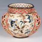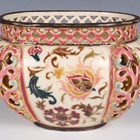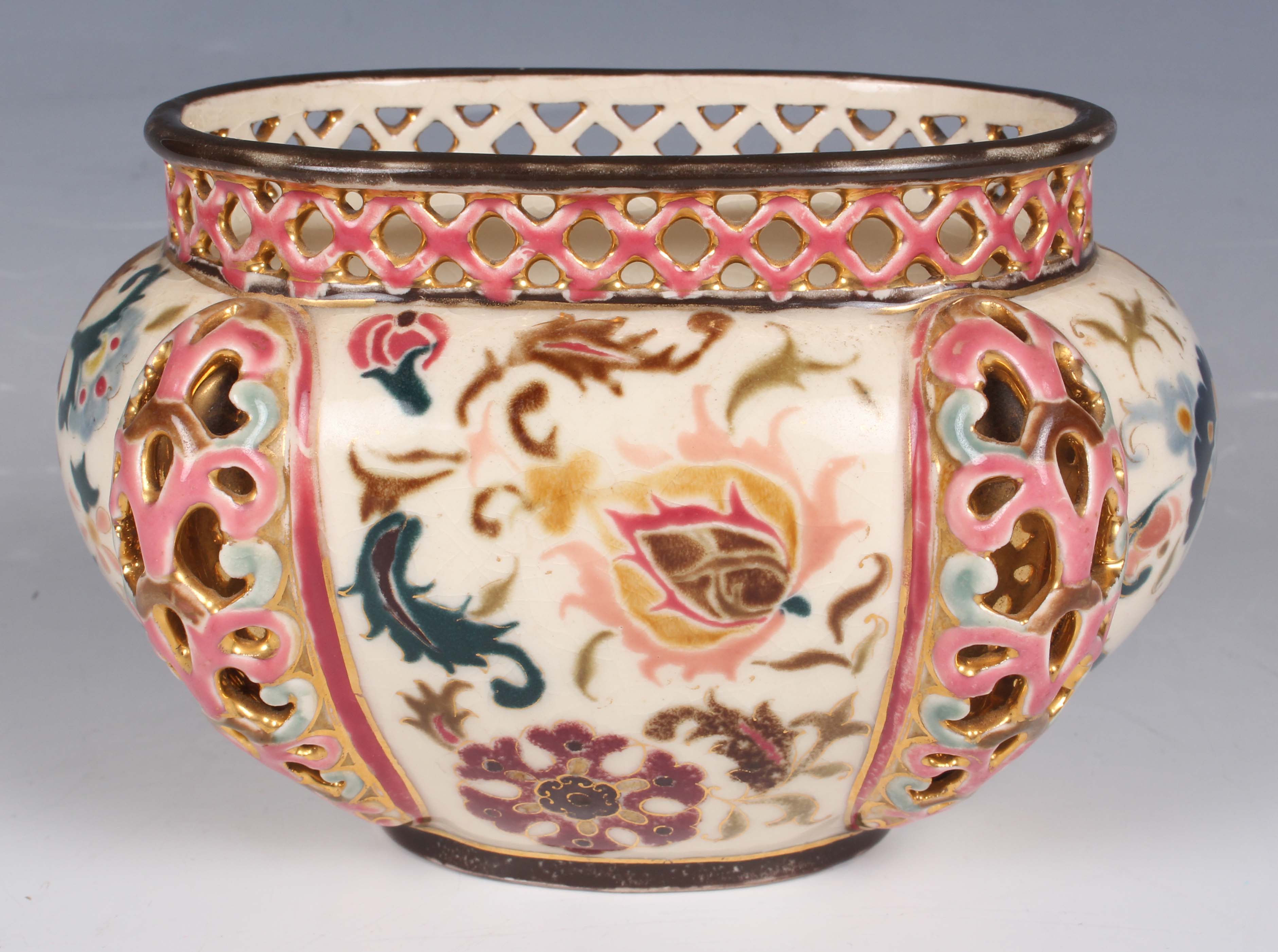 A Zsolnay Pecs oval jardinière, early 20th century, painted and gilt with Isnik style flowers within four reticulated lobed panels, beneath a pierced gallery rim, blue printed, painted and impressed marks to base, length 15cm.