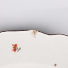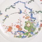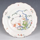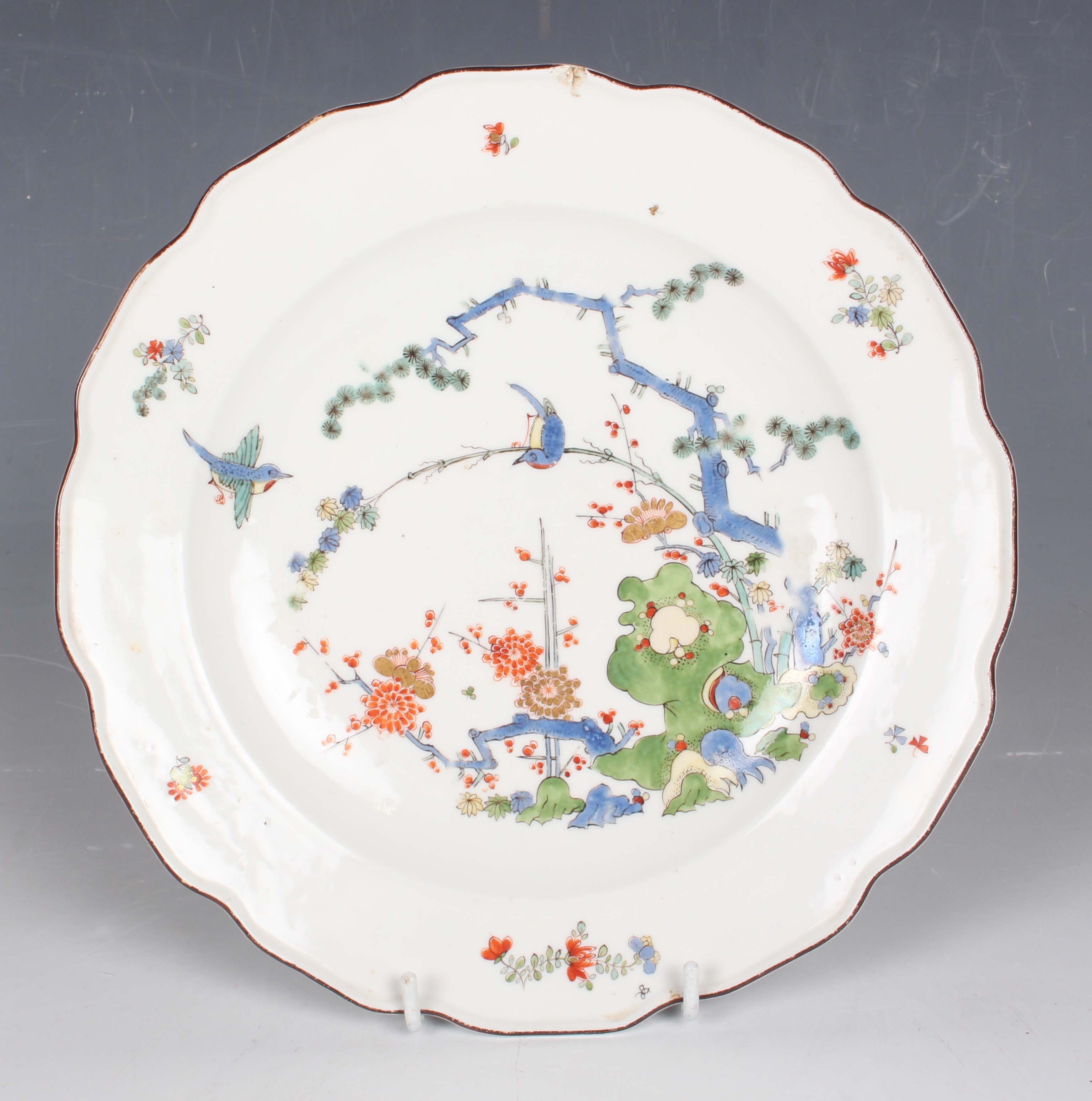 A Meissen porcelain Kakiemon plate, circa 1740, painted with The Three Friends of Winter within a brown edged shaped rim, crossed swords mark in underglaze blue to base and impressed numerals '16', diameter 23.3cm (faults).
