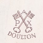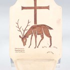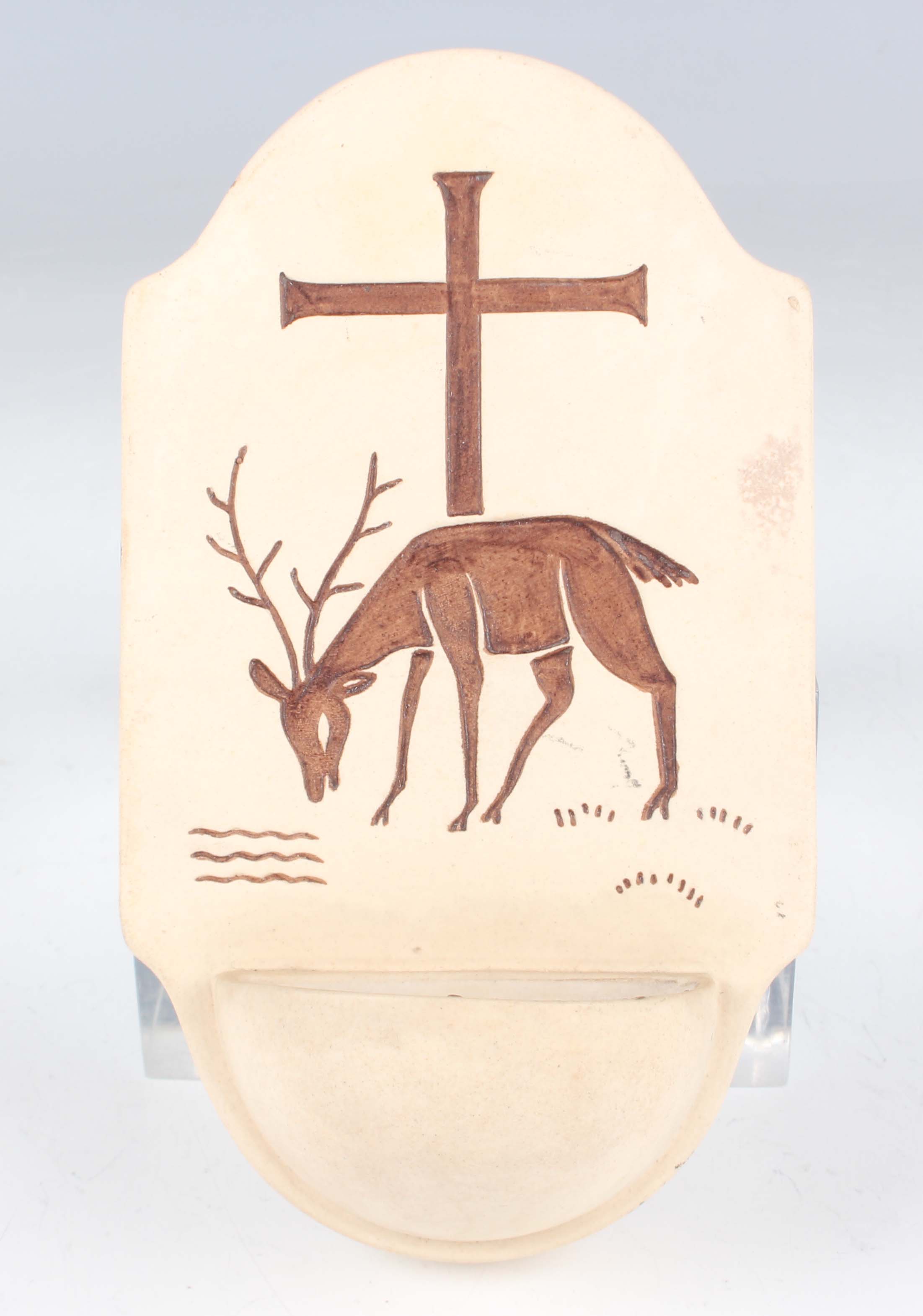 A rare Royal Doulton Prinknash pottery holy water font, 1930s, decorated with a grazing deer before a cross, brown printed crossed keys mark to reverse and incised 8140, height 12cm.