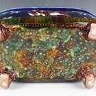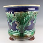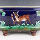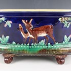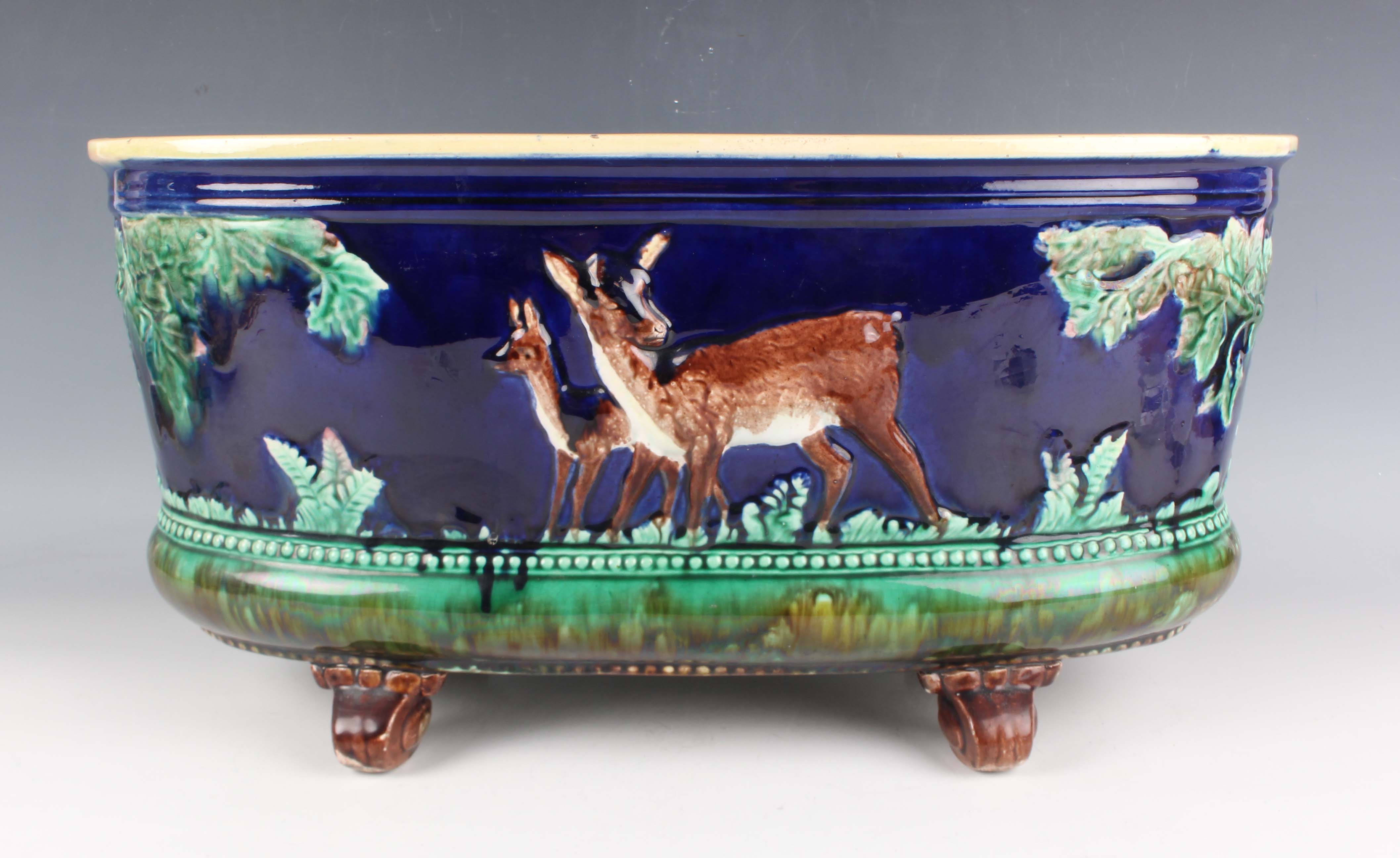 A majolica planter, late 19th century, probably Thomas Forester & Sons, of oval shape raised on four brown glazed scroll feet, moulded with deer between trees against a cobalt blue ground, pink glazed interior, black painted mark to base, length 36cm (faults).