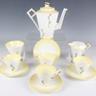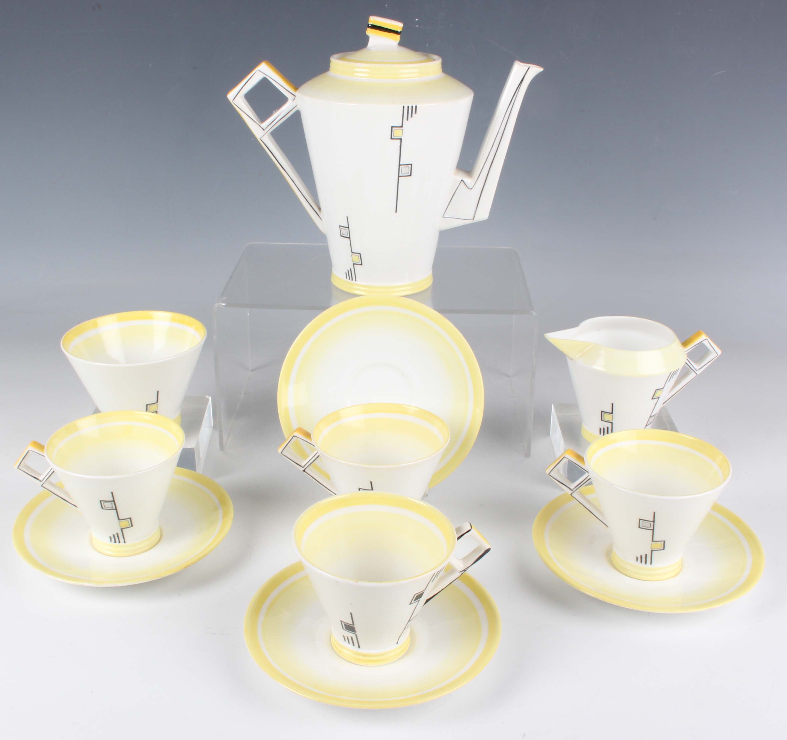 A Foley China E. Brain & Co. Art Deco part coffee set, 1930s, decorated with a black and yellow geometric pattern within yellow banded detail, comprising coffee pot and cover, four teacups and saucers, milk jug and sugar bowl.