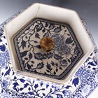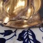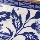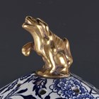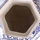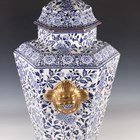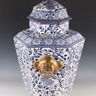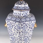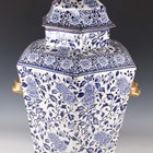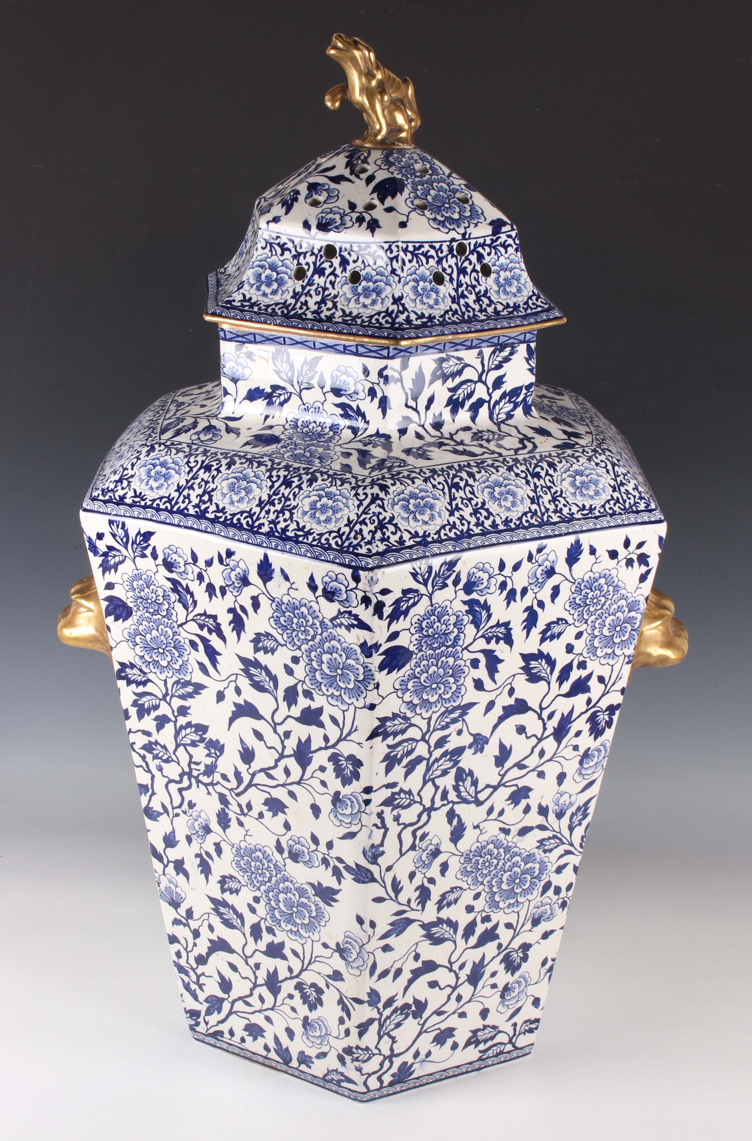 A very large Mason's style potpourri jar, inner liner and cover, mid to second half 19th century, possibly Ashworth, of hexagonal shape printed in blue with flowers and foliage, flanked by gilt stylized dolphin head and ring handles, the pierced cover with Dog of Fo style gilt finial, unmarked, height 77cm (some faults and repairs).
