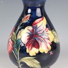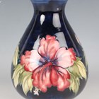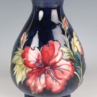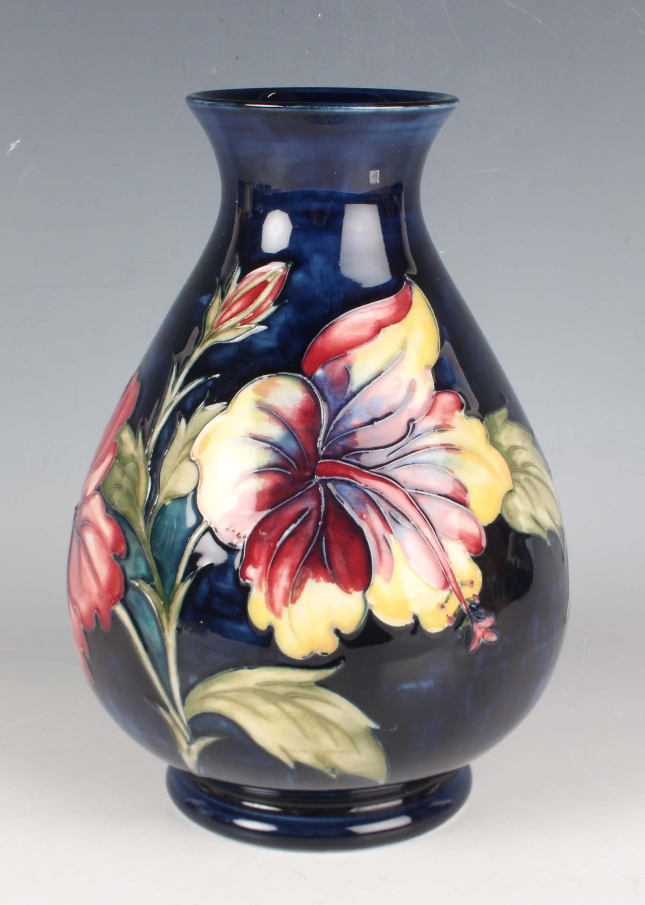 A Moorcroft Pottery Hibiscus pattern vase, 1953-78, with cobalt blue ground, impressed marks to base with blue painted initials and applied paper label, height 20.5cm.