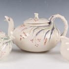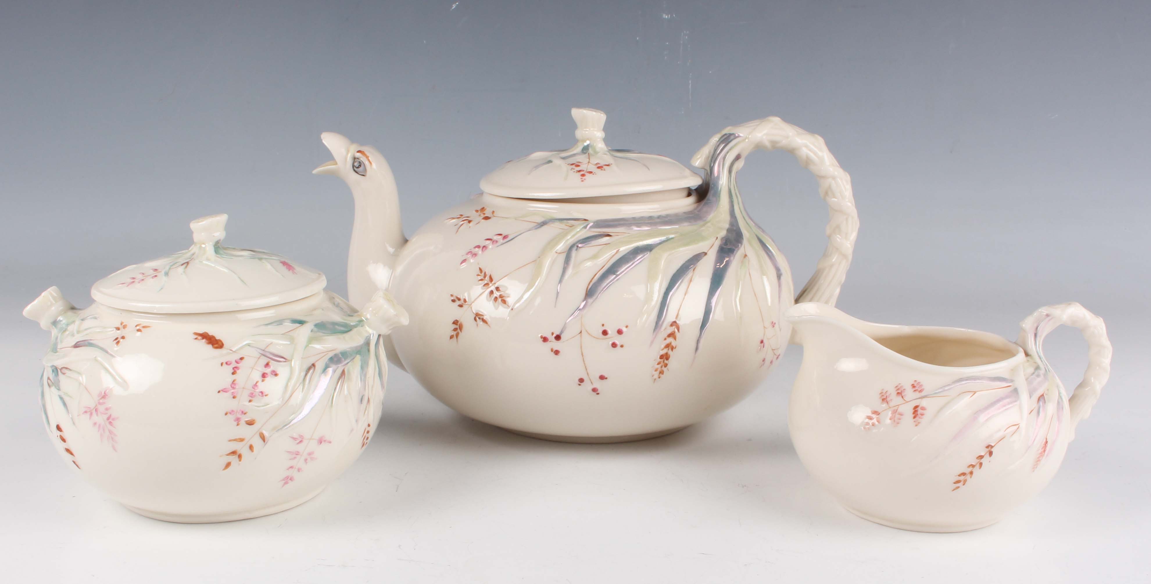 Three pieces of Belleek decorated in the Grass pattern, First Period black mark, 1863-90, comprising a teapot and cover, milk jug and sugar bowl and cover (faults).