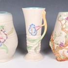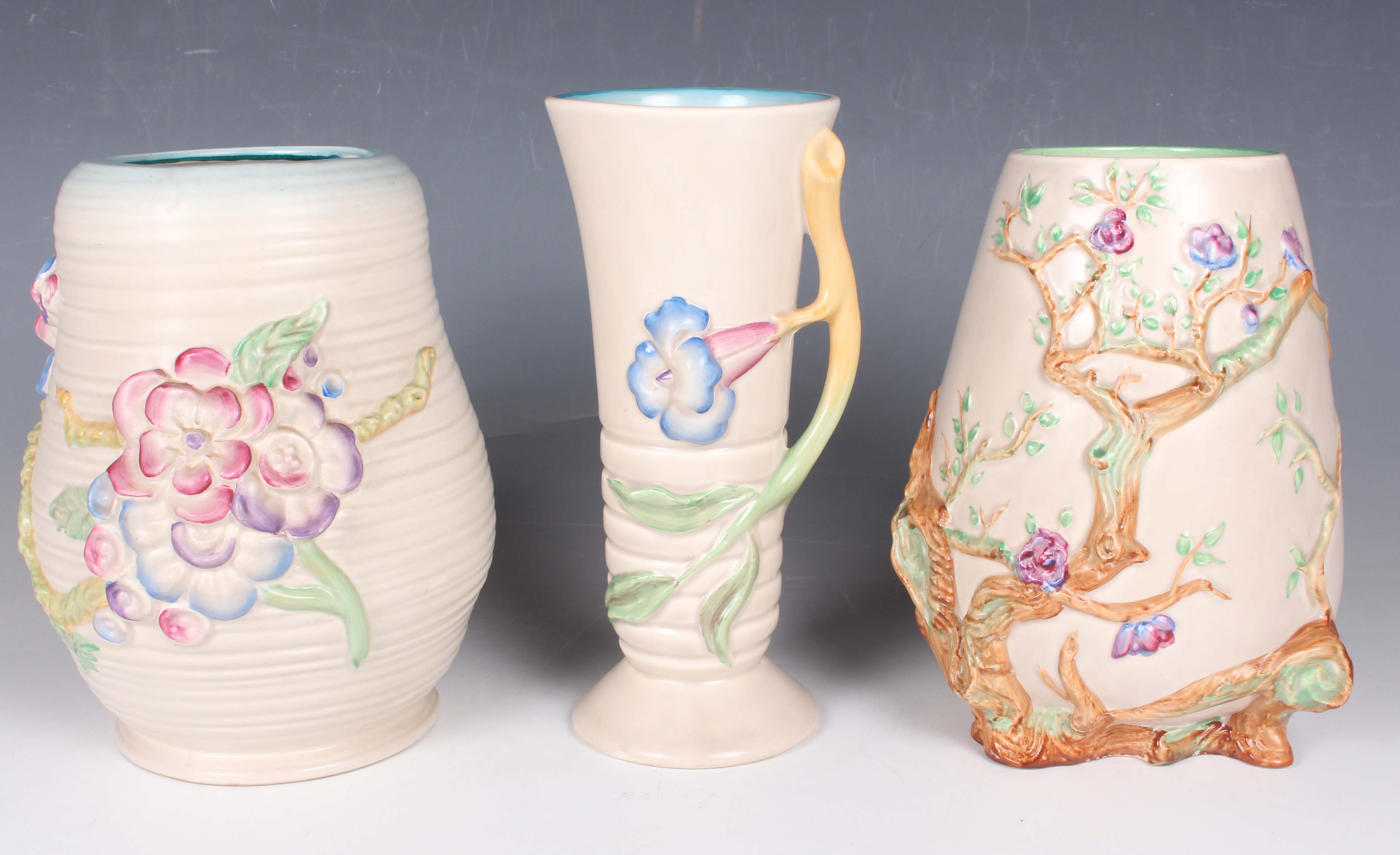 Three pieces of relief moulded Clarice Cliff, post-war, comprising an Indian Tree pattern vase, height 20cm, a My Garden ribbed vase, height 20.5cm, and a single handled vase, height 22cm.
