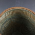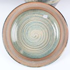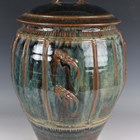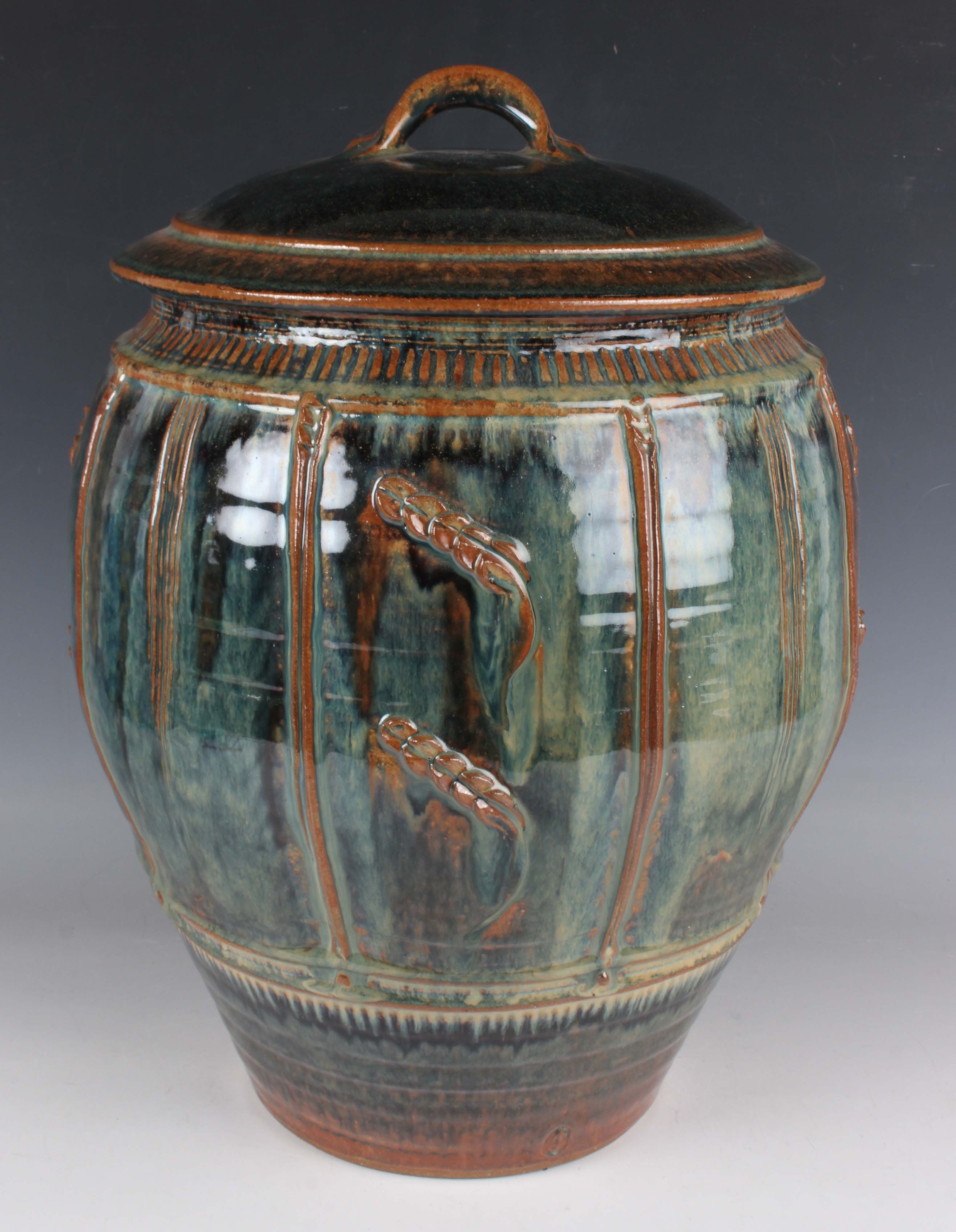 A Jano Clarke studio pottery large jar and cover, covered in a mottled bluish-green and brown glaze, decorated with stems of wheat, impressed mark to side of base, height 42cm.