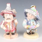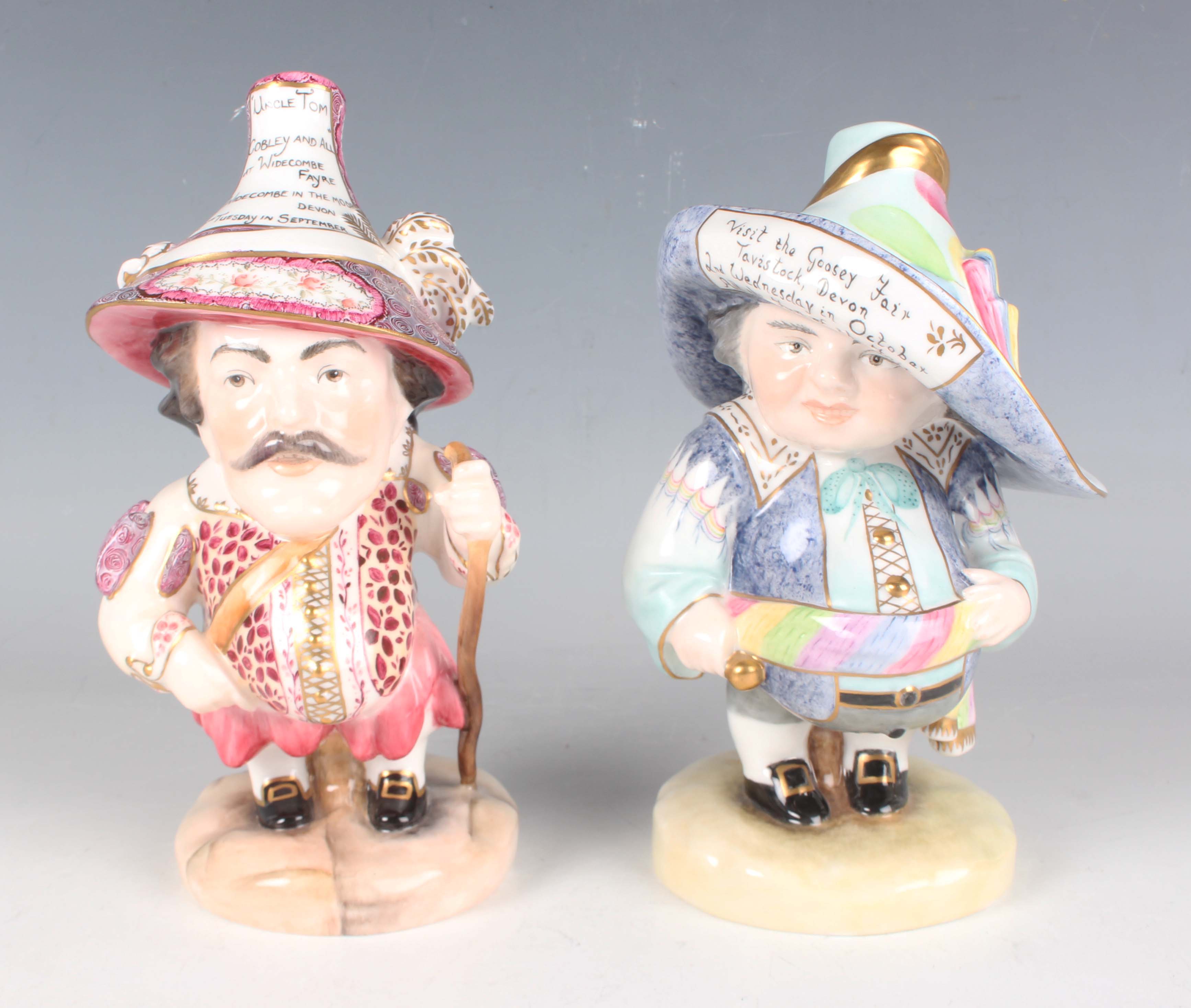 A pair of Royal Crown Derby Mansion House Dwarves, dated 1987, the first advertising Widecombe Fayre, signed P. Whittaker to the base, height 17.5cm, the second the Goosey Fair, signed J. Griffiths to the base, height 17cm, with fitted boxes.