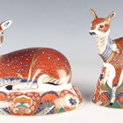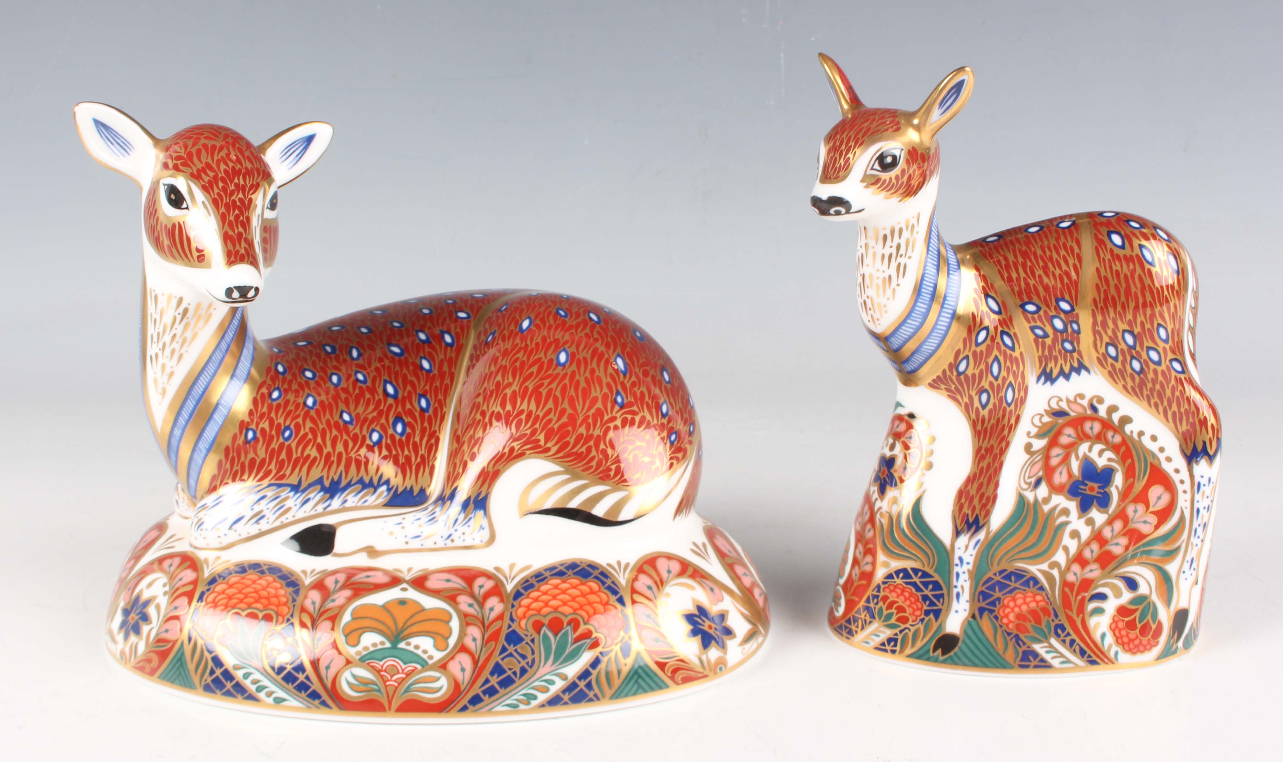 Two Royal Crown Derby Collectors Guild exclusive Japan pattern Imari decorated paperweights, the first a recumbent Roe Deer, dated 1994, height 13cm, stopper to base, the second a Fawn, height 13.5cm, stopper to base.