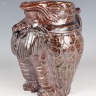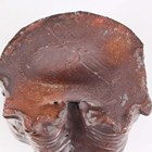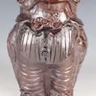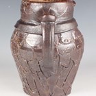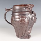 A stoneware studio pottery jug in the form of a grotesque bird, probably Australian, Bendigo Pottery, in the style of Martin Brothers, with incised, applied and moulded detail, its beak forming the spout above a spotted bow tie and buttoned waistcoat, unmarked, height 20cm.