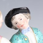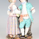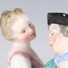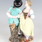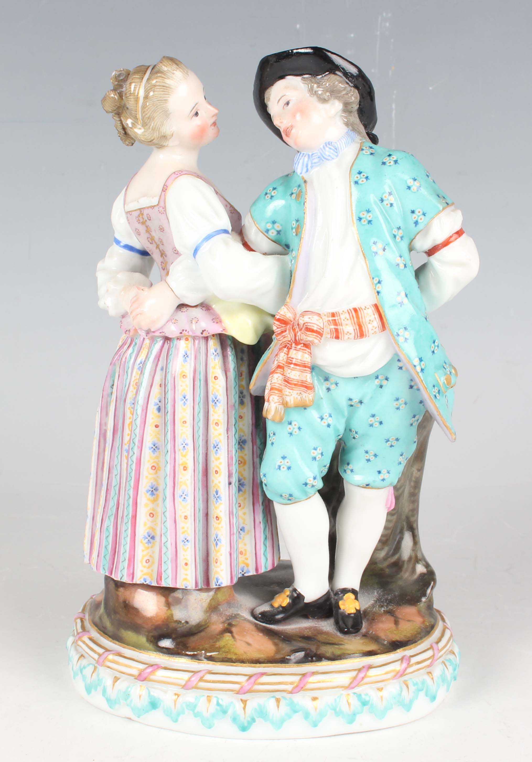 A Meissen porcelain figure group of a couple dancing, late 19th century, modelled after Acier, raised on a naturalistic oval base moulded with a stiff leaf border to the edge picked out in turquoise and pink enamels and gilding, blue crossed swords mark to base, incised model No. C.66 and impressed numerals, height 14.5cm.