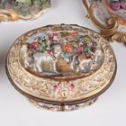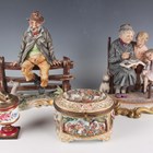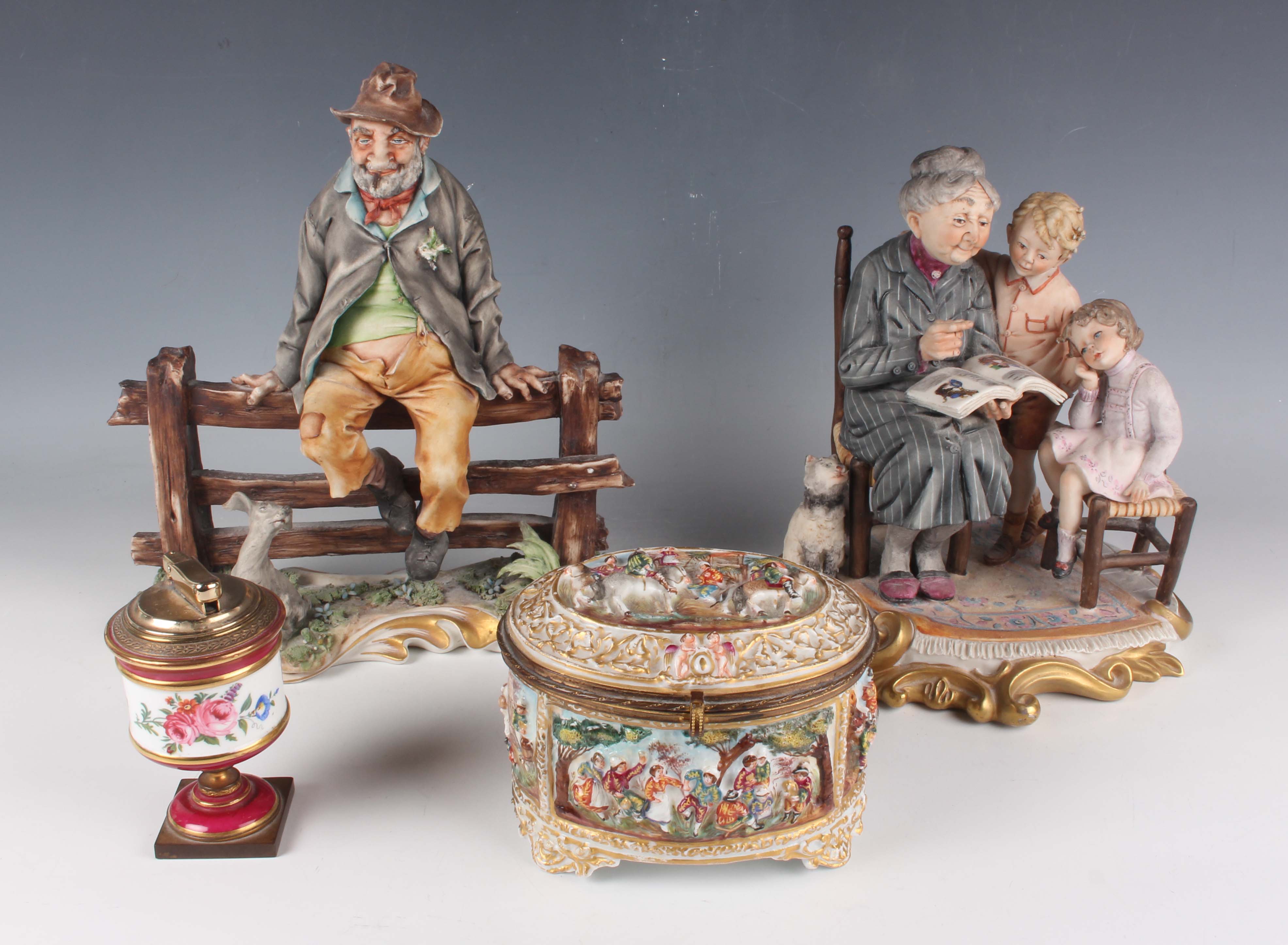 A Capodimonte porcelain gilt metal mounted gilt lined oval box with hinged lid, late 19th/early 20th century, moulded with panels of revelrous figures within gilt foliate scroll frames, raised on gilt enriched scroll moulded feet, underglaze blue crowned 'N' mark to base, length 13cm, height 10cm (restored), together with two Capodimonte figure groups, the first depicting a grandmother reading nursery rhymes to her grandchildren, height 22cm, the second with a tramp seated on a fence, height 27cm, and a Halcyon Days table lighter.