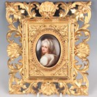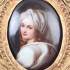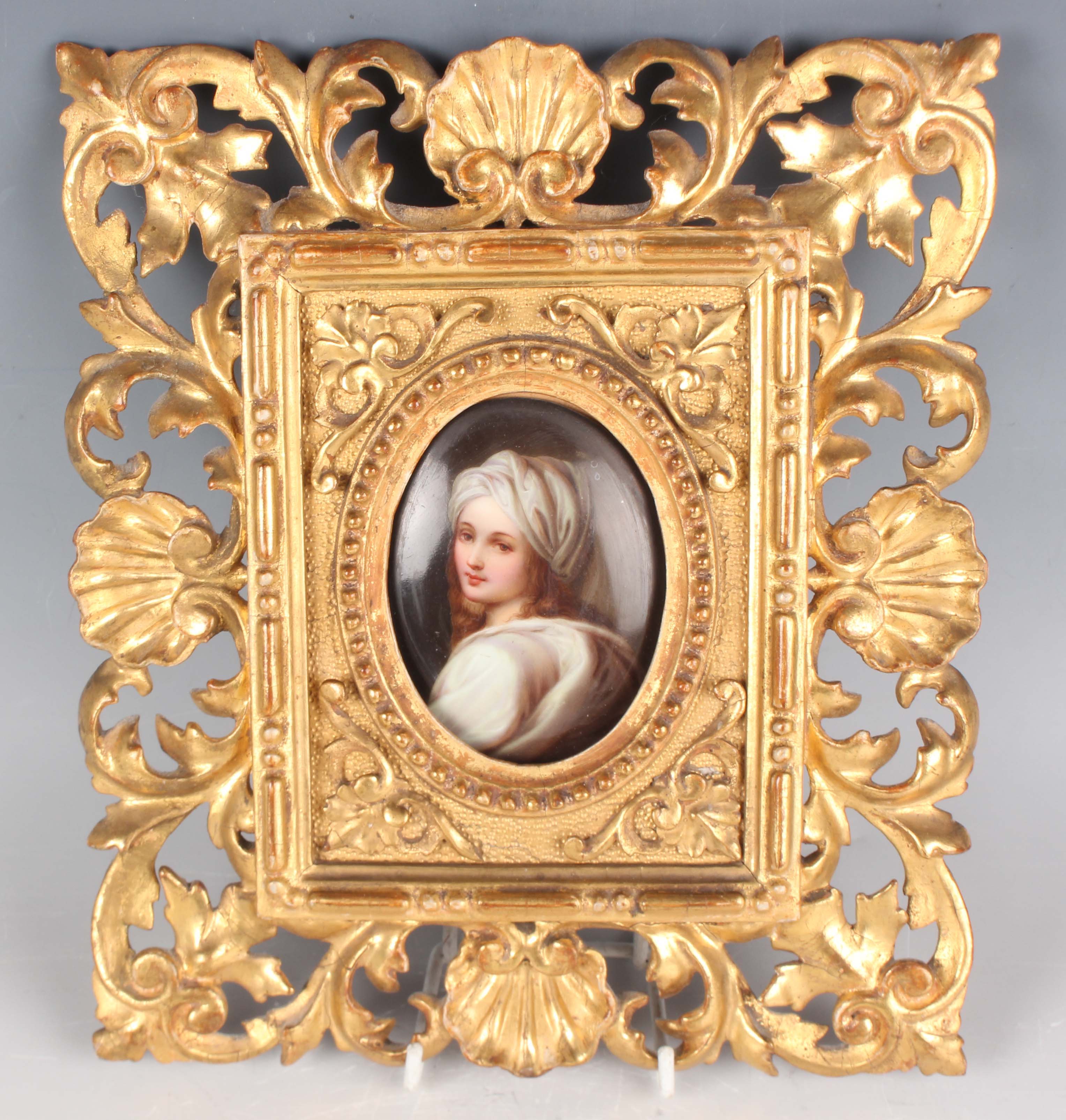 A Continental porcelain oval plaque, late 19th century, painted with a half-length portrait of Beatrice Cenci, believed originally to be after Guido Reni but now probably after Ginevra Cantofoli, held within a gilt softwood and gesso foliate and shell frame, plaque height 8cm, dimensions of frame 22cm by 19cm.