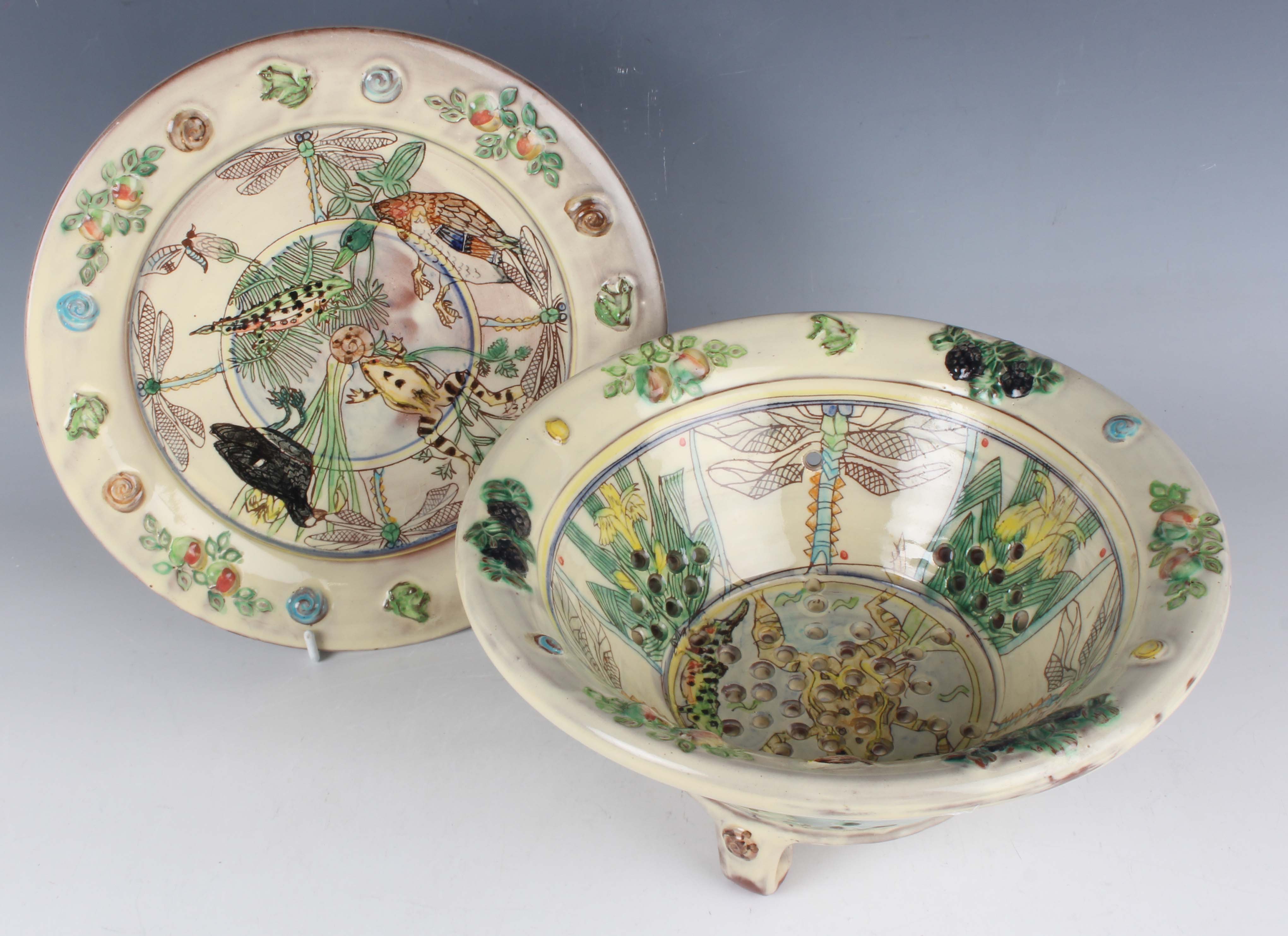 A Maureen Minchin studio pottery circular strainer and stand, the strainer decorated with a frog and newt to the pierced base interior within a surround of dragonflies and iris, its rim with applied fruit, the exterior with aquatic plants, raised on scroll feet, the stand with aquatic animals and insects within a matching relief rim, diameter of stand 24cm.
