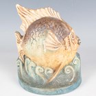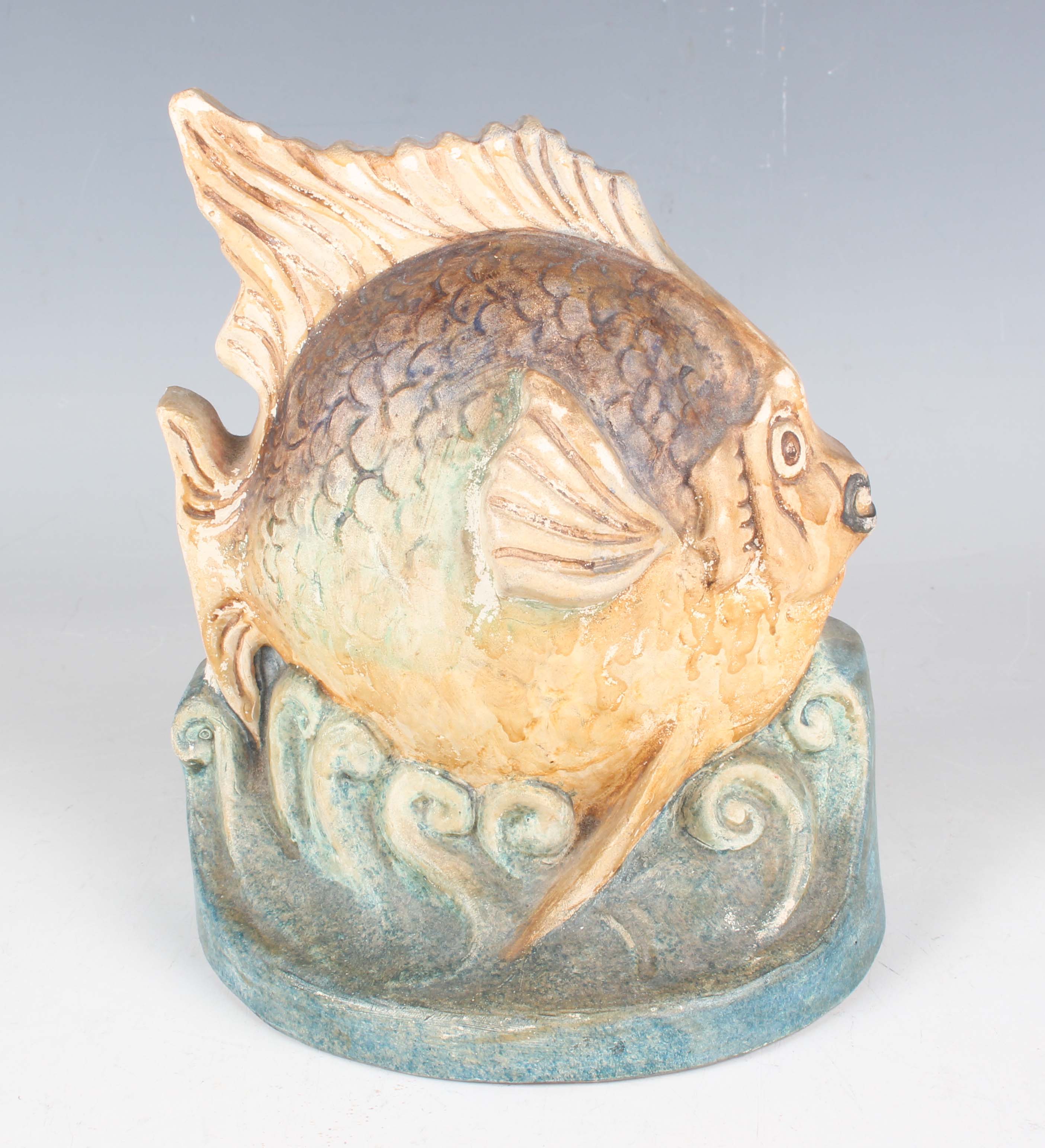 A pottery bookend, probably Compton Art Potters' Guild, 1920s, designed as a fat fish on a hemispherical base moulded with small waves, unmarked, height 14.5cm (faults).