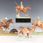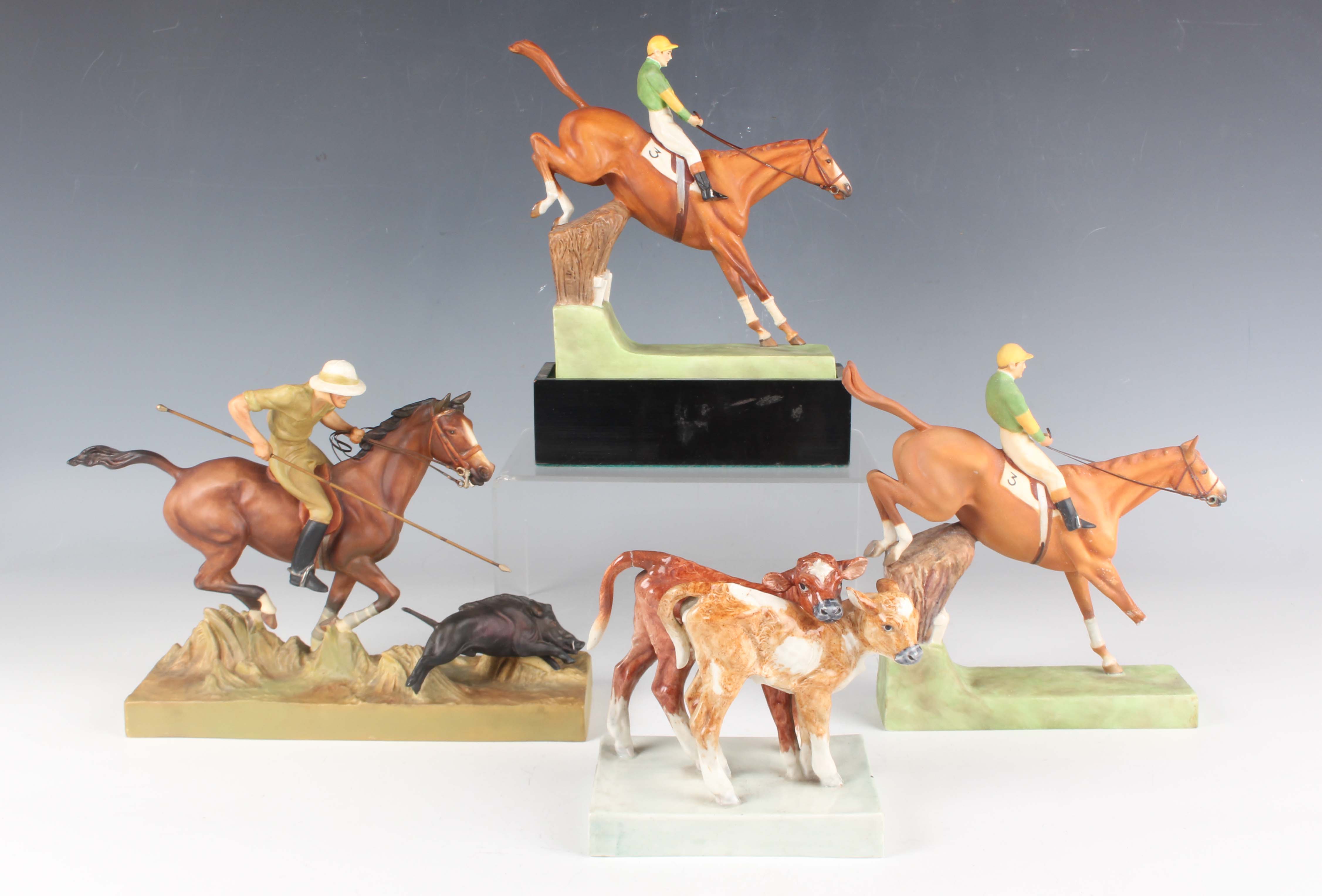 A Royal Worcester figure group of 'Hog Hunting', modelled by Doris Lindner, printed marks including '3164' to base, height 17.8cm (restored), together with two Royal Worcester figures of 'Over the Sticks', modelled by Doris Lindner, height 18cm (one repaired and one missing leg), and a Royal Worcester figure of 'Calves', modelled by Doris Lindner, height 11.4cm (faults).