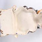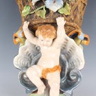 A Continental majolica wall pocket, circa 1900, modelled as a putto seated within a shell with foot resting on an acanthus leaf, supporting a floral encrusted basket with pierced rim, unmarked, length 34cm.
