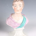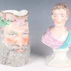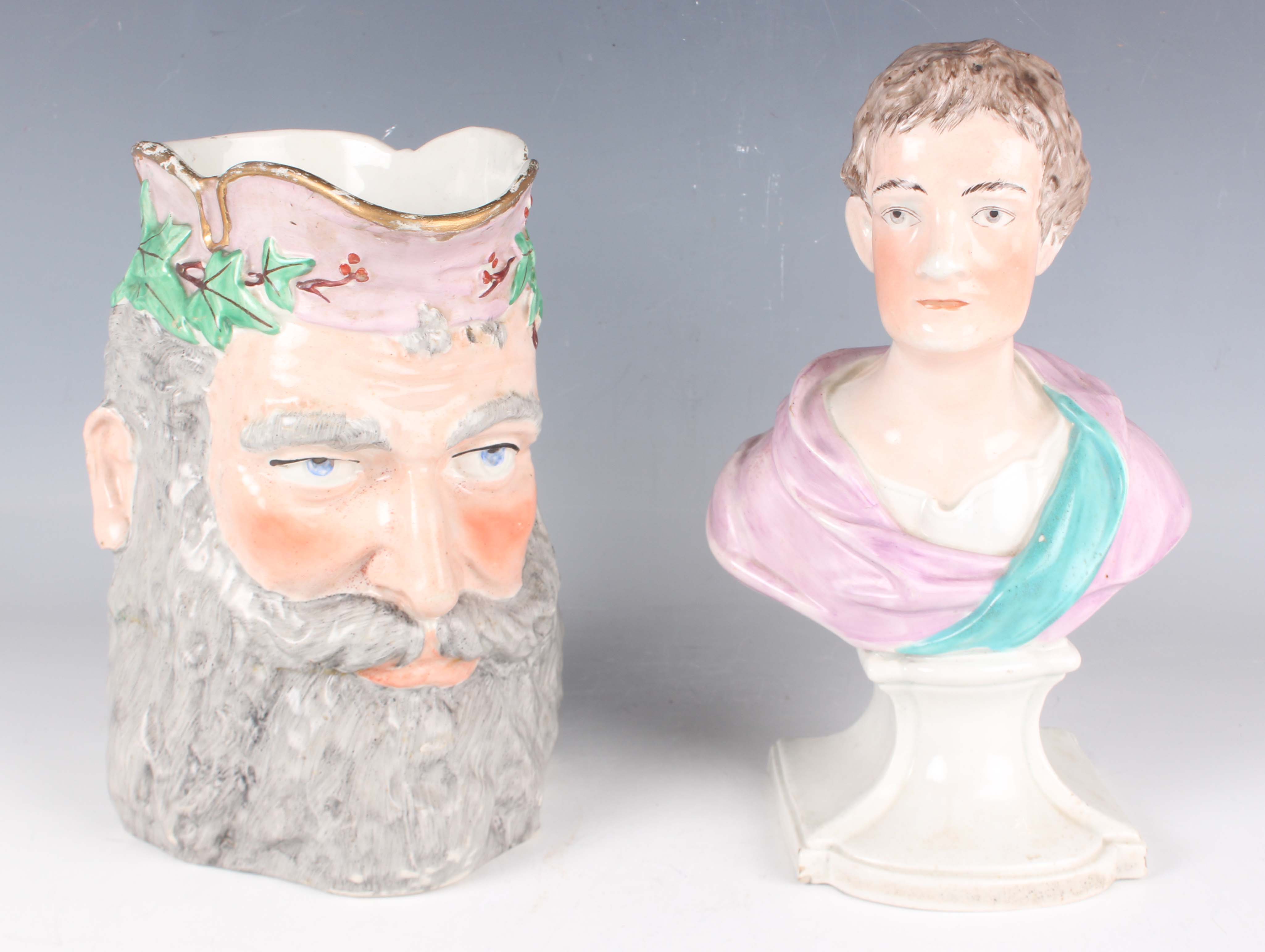 A Staffordshire pearlware pottery bust of Newton, early 19th century, with turquoise and lilac glazed clothing, raised on a socle base, impressed 'Newton' to reverse, height 22cm (minor chips to base), together with a Staffordshire pottery character jug depicting Bacchus, height 19.5cm (faults).