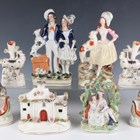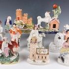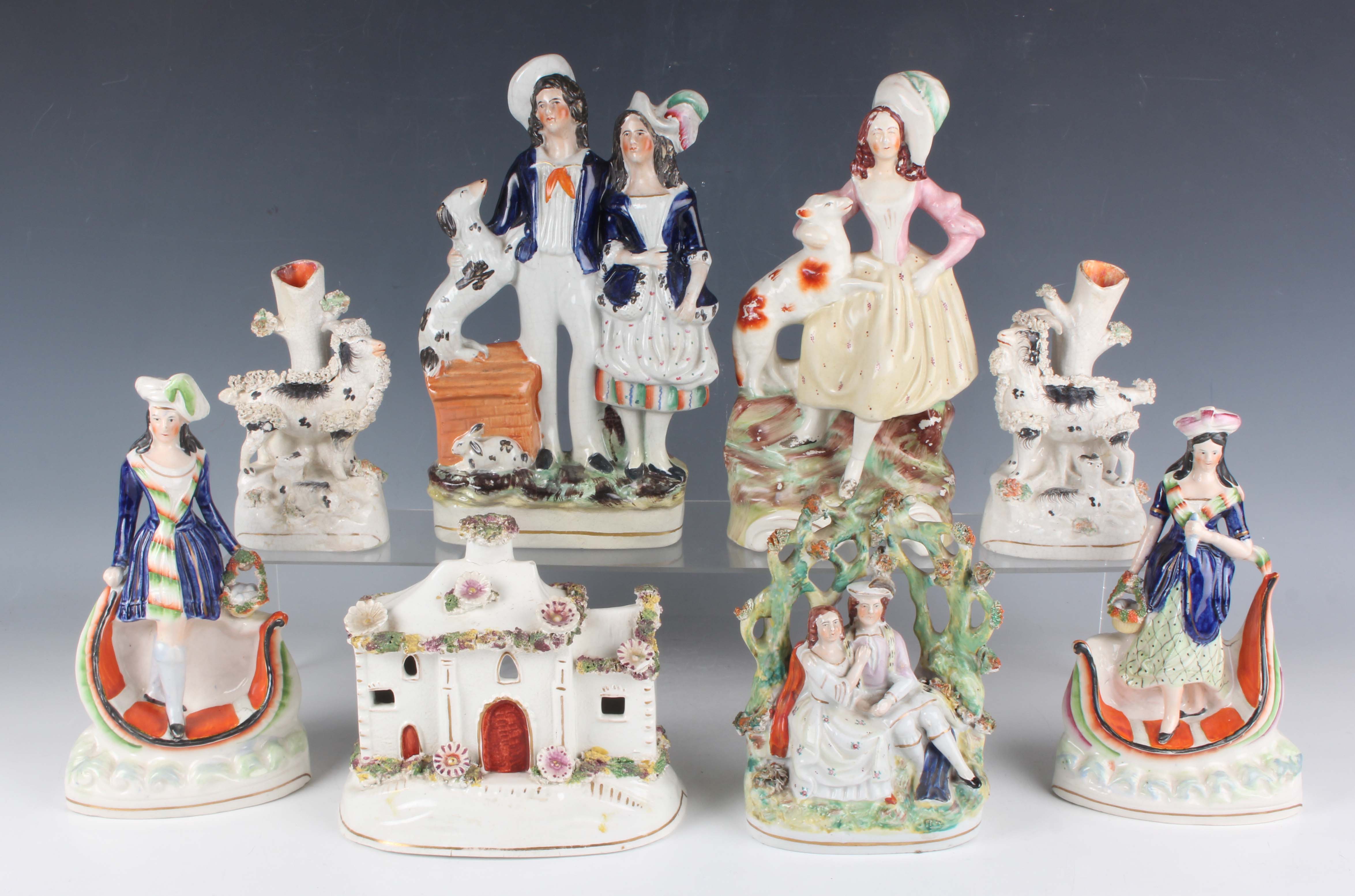 A pair of Staffordshire pottery figures, mid to late 19th century, modelled as a man and woman, each holding a basket of fish and standing in a boat, heights 19cm and 20.5cm (woman's neck glued), together with a collection of other Staffordshire pottery figures, including a pair of goat spill vases, height 14.7cm, model of a church, height 15cm, and various figures accompanied by animals (some faults).