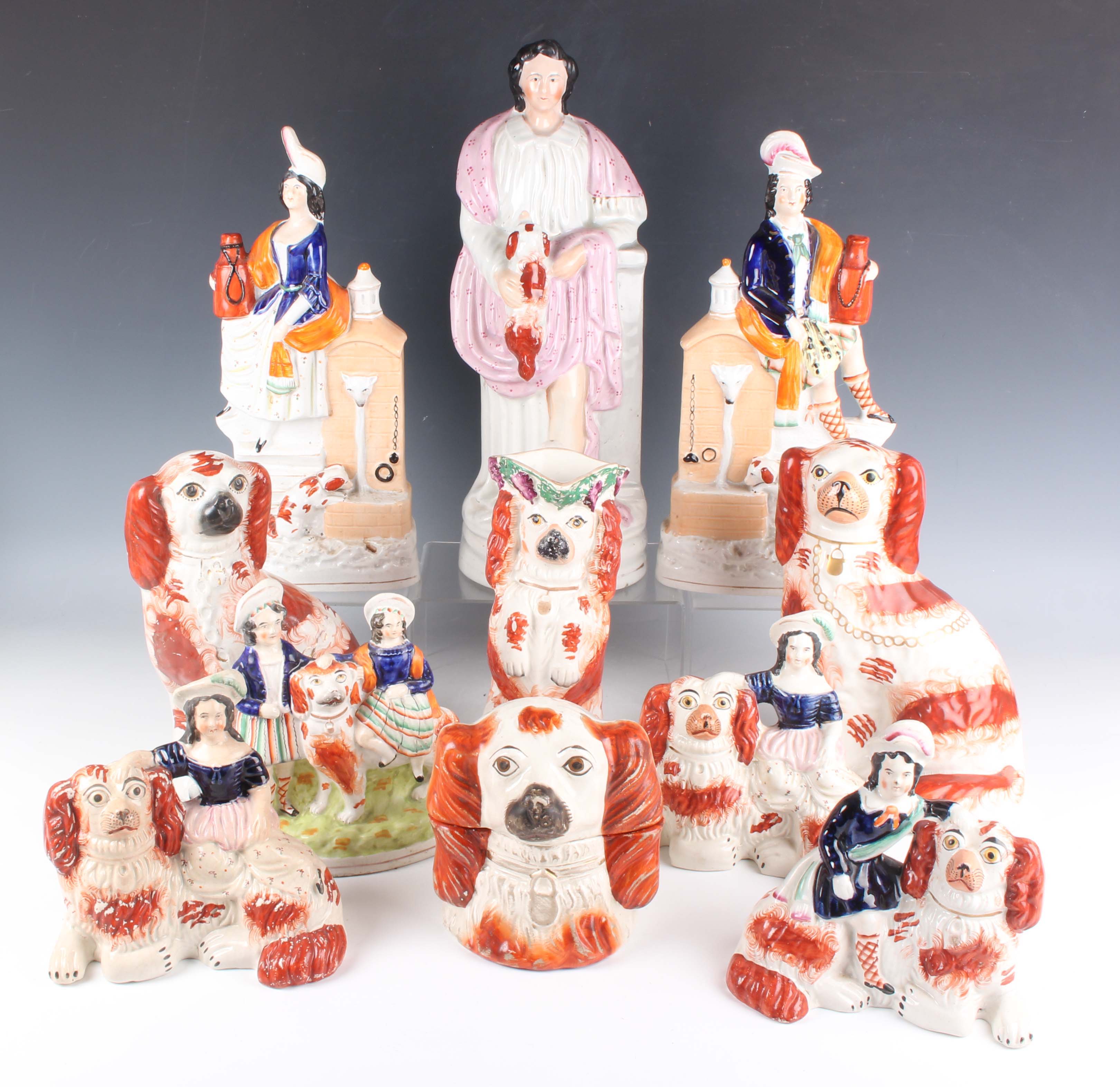 A pair of Staffordshire pottery figures, late 19th century, each modelled with a child seated on the back of a recumbent spaniel with iron red patch decoration, height 15.5cm, a pair of Staffordshire pottery figure groups of a lady and gentleman seated beside a water fountain whilst a spaniel drinks from the trough below, height 33.5cm, and a group of Staffordshire pottery figures featuring iron red and white spaniels, including a water jug and a jar and cover (some faults).