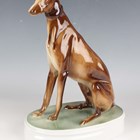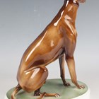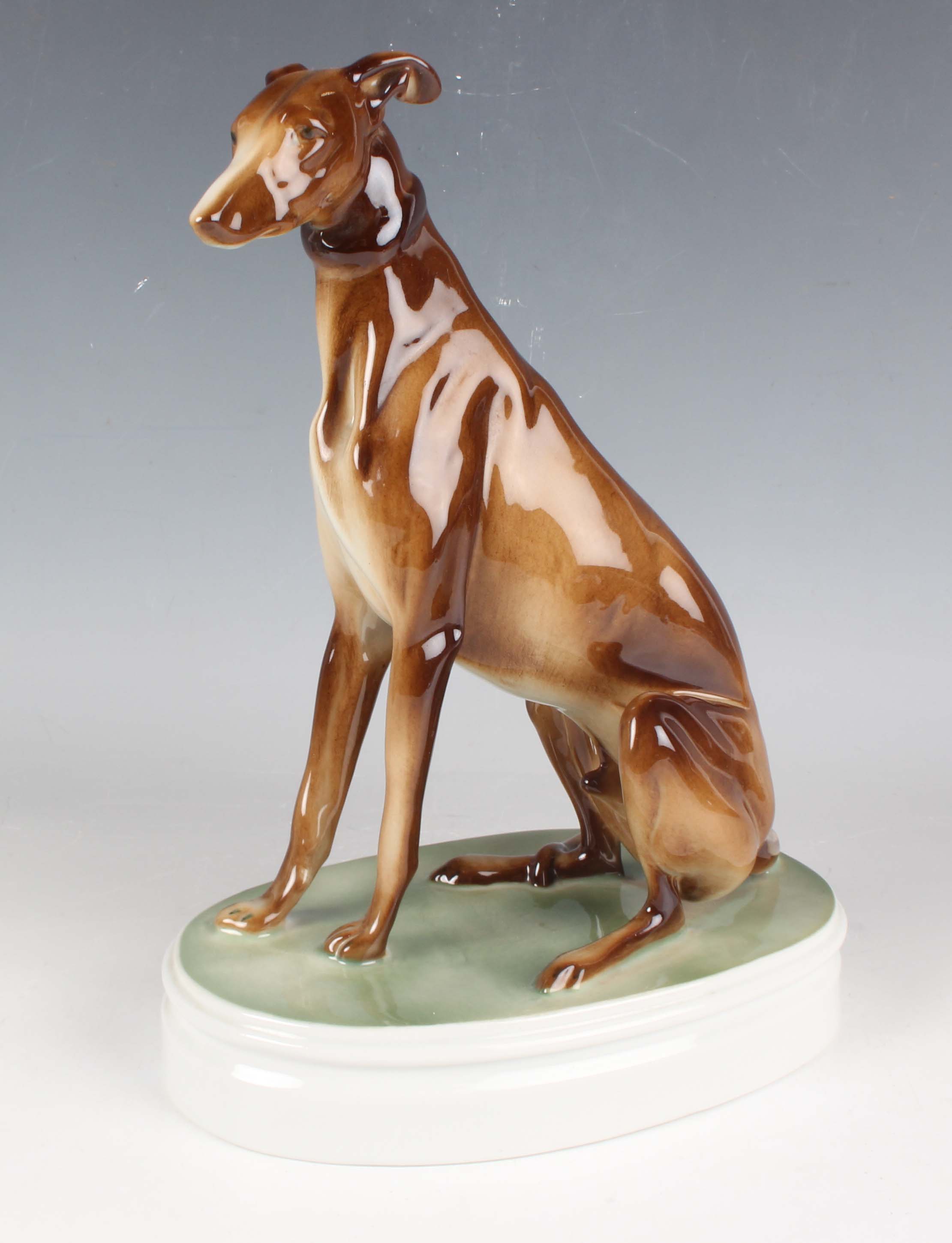 A Zsolnay Pecs porcelain figure of a seated greyhound, on an oval plinth base, green printed factory mark to base, height 25.5cm.