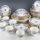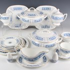 A matched Coalport Revelry pattern part service, comprising eight dinner plates, diameter 27.5cm, six salad plates, diameter 22.8cm, twenty dessert plates, diameter 20.5cm, ten tea plates, diameter 17.5cm, six small plates, diameter 15.3cm, two sandwich or cake plates, two circular tureens and covers, sauce boat and stand, pepper and salt, five two-handled soup bowls, ten teacups, twelve saucers, milk jug and two-handled sugar bowl and cover (faults).