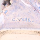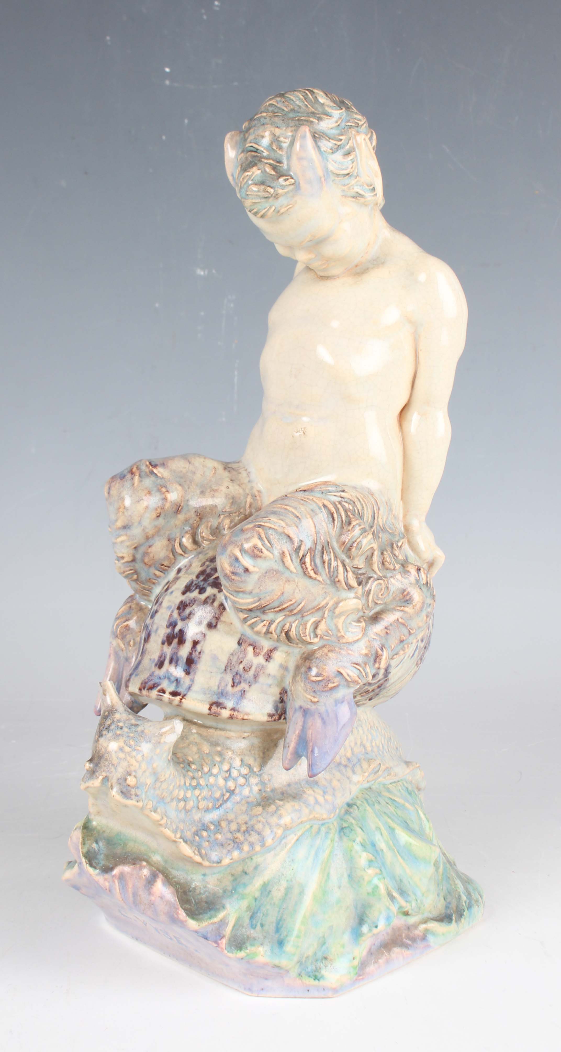 A Charles Vyse pottery figure The Morning Ride, circa 1925, modelled as a young faun seated on the back of a snail, painted in muted tones of green, lilac, purple and blue, incised 'C. Vyse', height 22.5cm (minor faults).