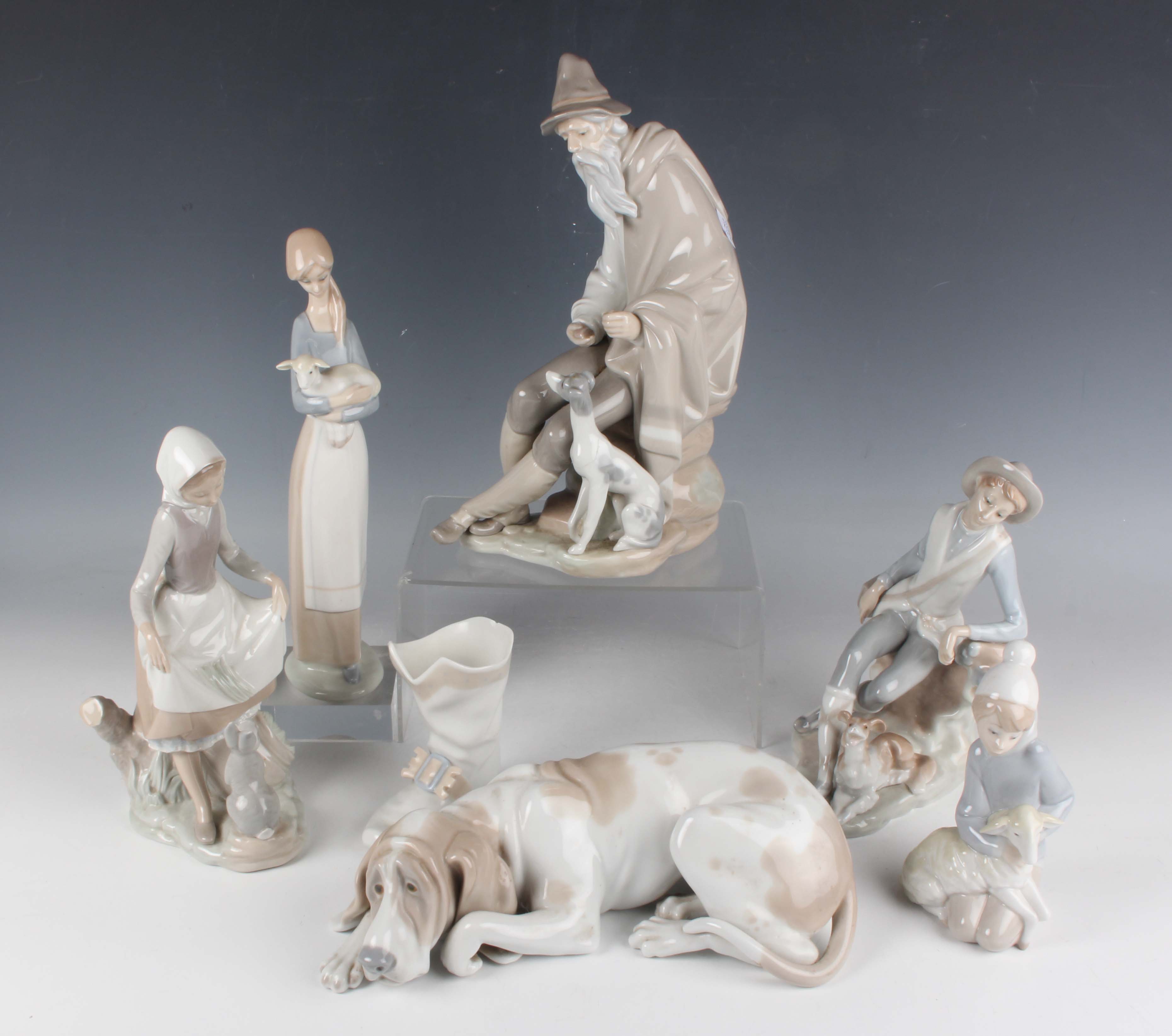 A group of Lladro porcelain, comprising Shepherd Boy With Dog, No. 4659, Beggar, No. 1094, Rabbit's Food, No. 4826, a girl holding a lamb, a boy with a sheep and a recumbent Old Dog Bloodhound, No. 1067, together with a Nao model of a boot (faults).