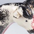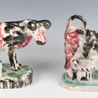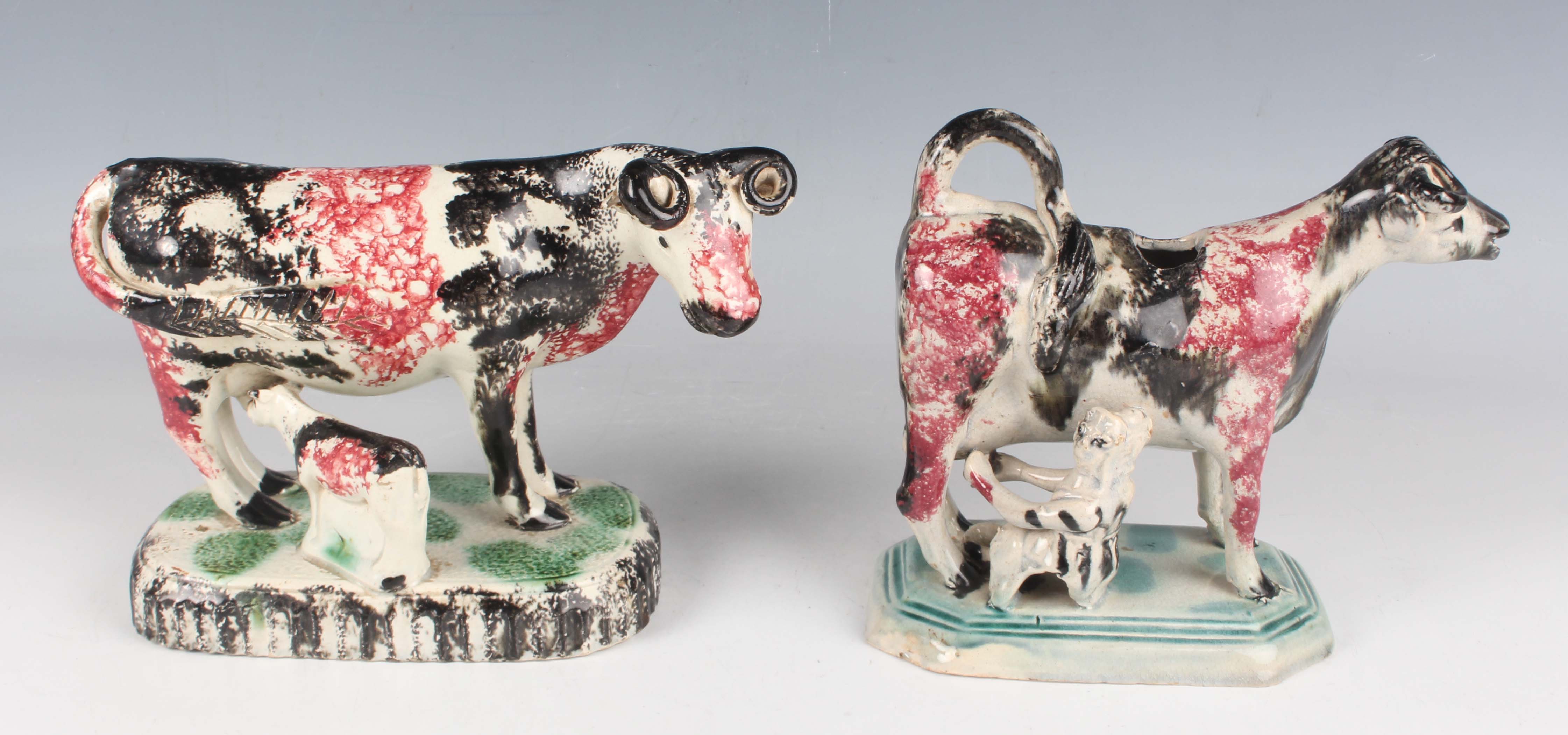 A Staffordshire pearlware figure of a cow and her calf, early 19th century, the standing cow and calf with black and raspberry sponged decoration, on an oval base with green spot and black sponged detail, height 13.2cm, length 19.2cm (minor faults), together with a similarly decorated pearlware cow creamer and milkmaid group, on a green cut cornered rectangular base, height 14cm, length 16cm (minor restoration and faults).
