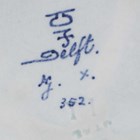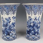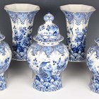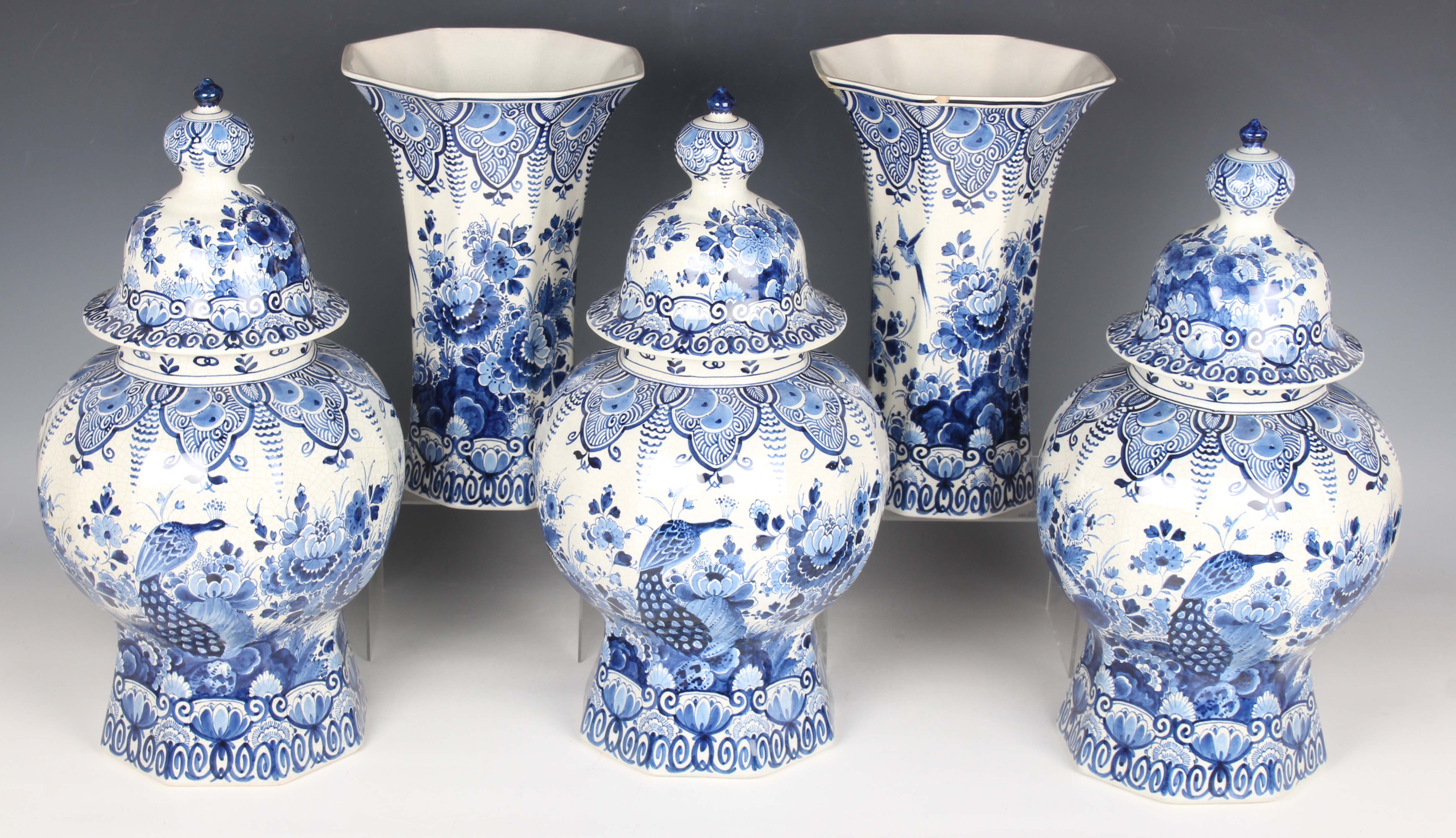 A Royal Delft De Porceleyne Fles garniture of five vases, dated 1902, each painted in shades of blue with a peacock amidst flowers and foliage between geometric and foliate borders, comprising two flared octagonal vases, height 25cm, and three octagonal vases and covers, height 37cm, blue painted and impressed marks to bases (minor faults).