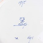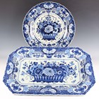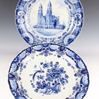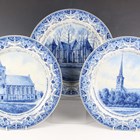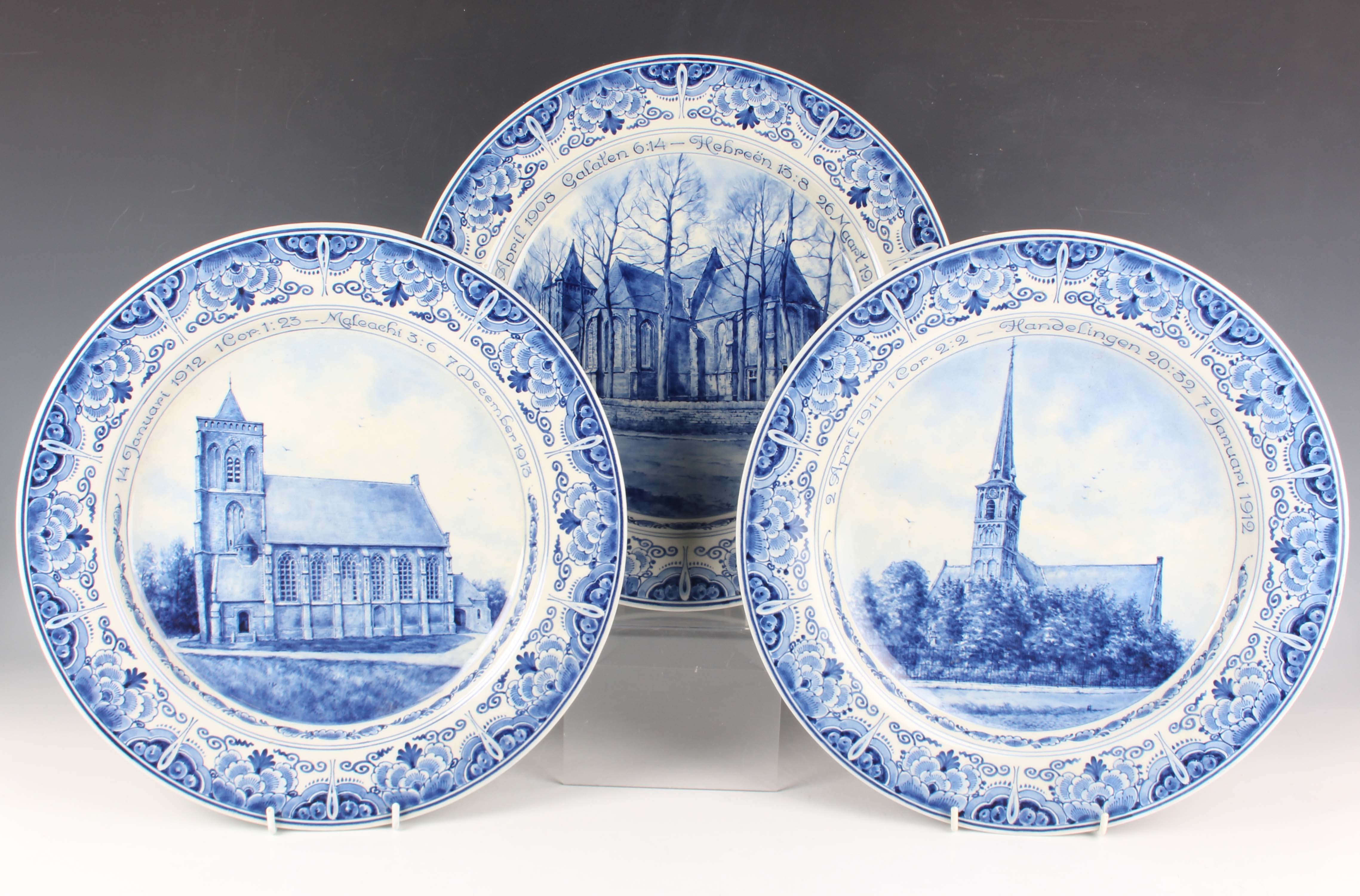 A set of three Royal Delft De Porceleyne Fles circular wall chargers, dated 1946, each painted in shades of blue with a topographical view of a church beneath dates and bible references within foliate borders, blue painted marks to reverse, diameter 33.5cm, a similar larger example, diameter 40.5cm, two other Royal Delft chargers painted with floral designs, both 40cm diameter, and a large rectangular Royal Delft platter painted in shades of blue with a basket of flowers, impressed Joost Thooft & Labouchere mark to base with other blue painted marks, length 57.5cm.