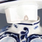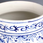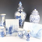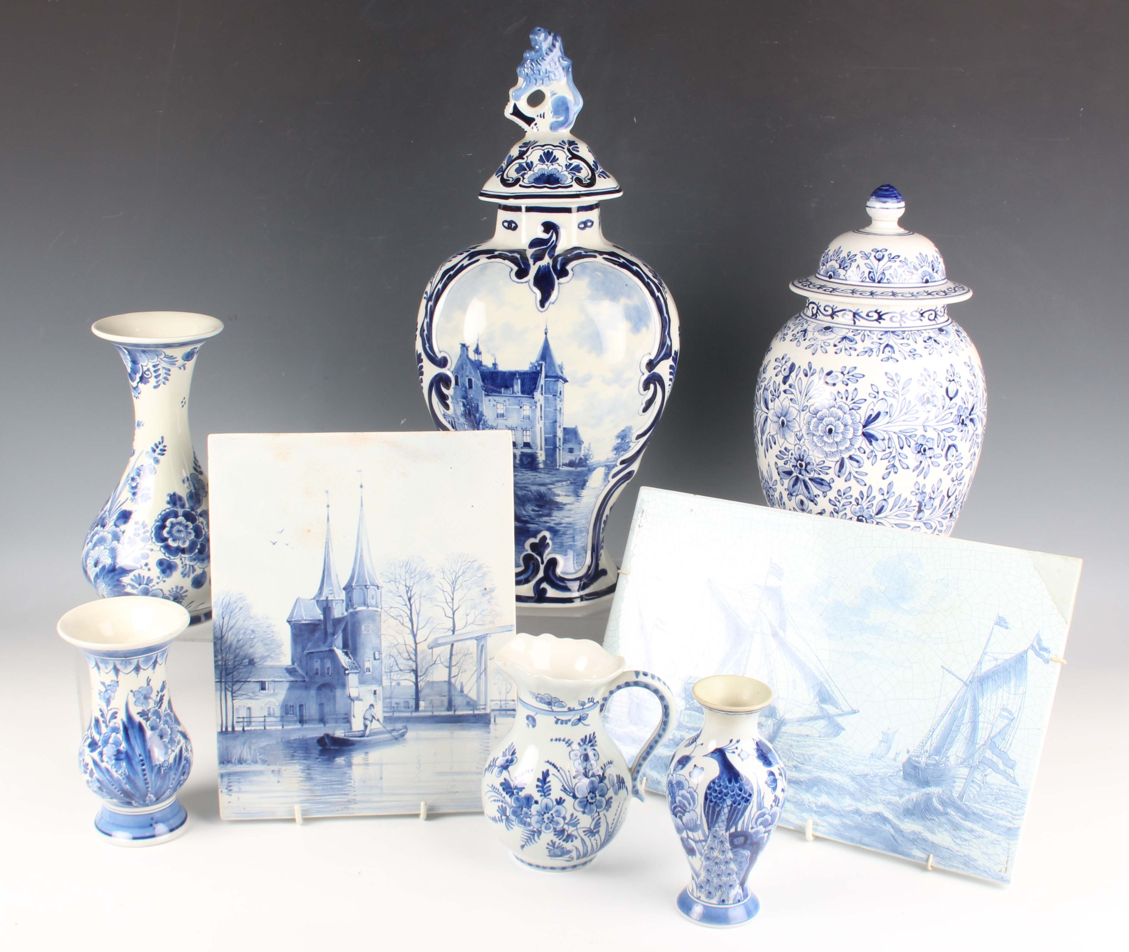 A Royal Delft De Porceleyne Fles vase and cover, early 20th century, the baluster body of flattened octagonal shape, painted in shades of blue with a riverside building within low relief moulded scroll framing, flanked by flowers and foliage, the cover with lion finial, blue painted and impressed marks to base, height 40.5cm, together with three other smaller Royal Delft vases and a jug, height 14cm, another vase and cover painted with flowers and foliage, height 30cm, and two Delft tile panels, one impressed Joost Thooft & Labouchere to reverse, 25.5cm by 19.5cm and 31cm by 21cm (some restoration).