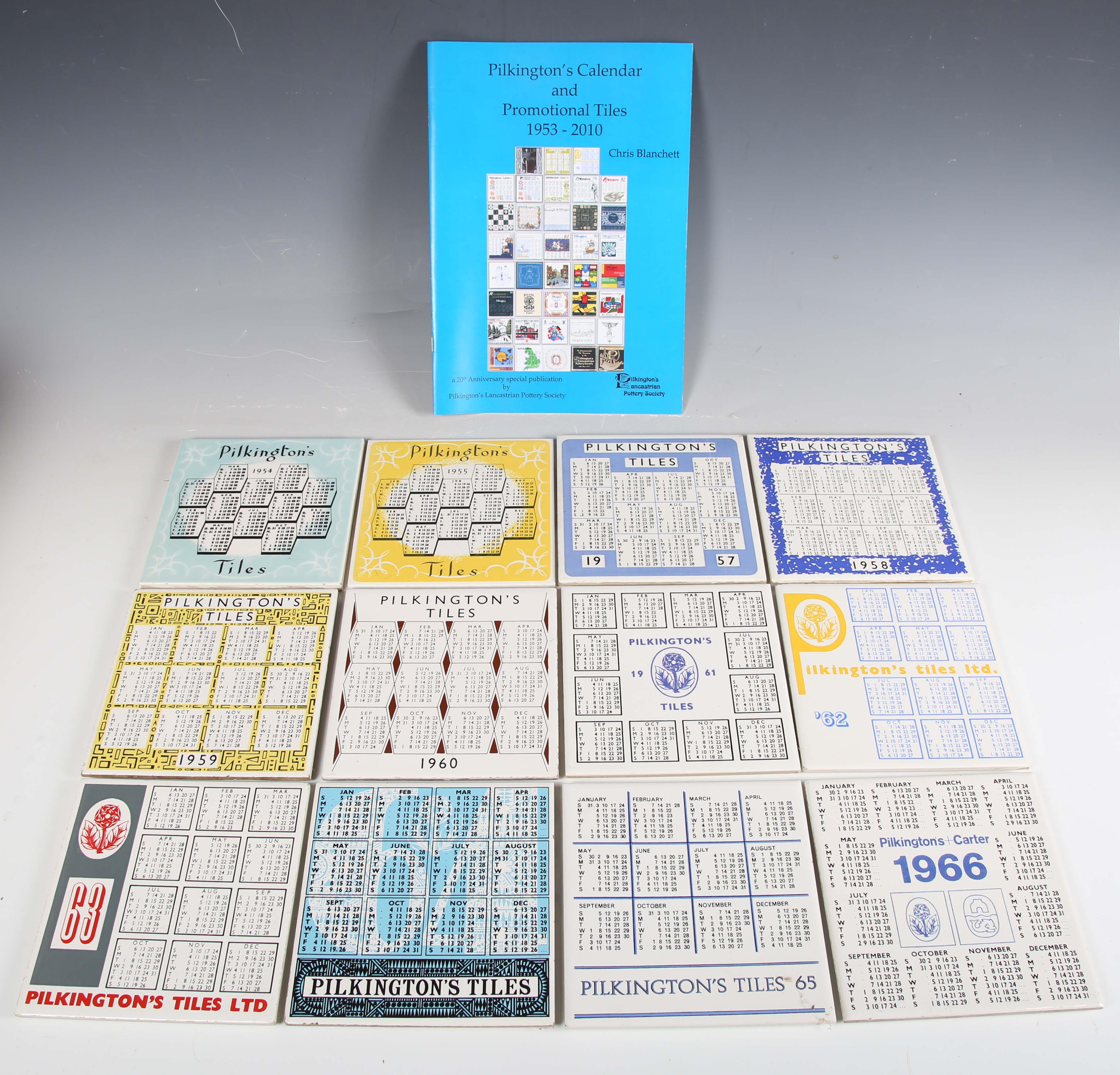 A complete run of Pilkington’s annual calendar tiles, dated 1954 to 2010, a mixture of screen and transfer printed, each tile 15.3cm square (tile dated 1956 missing but no examples have been found to exist), together with the publication 'Pilkington’s Calendar and Promotional Tiles 1953 to 2010', a 20th Anniversary special publication from Pilkington’s Lancastrian Pottery Society, written by Chris Blanchett. Note: the lot includes more than one version of the calendar tile for some years. Pilkington’s purchased Carter Tiles in 1965 and after this date sometimes more than one tile was produced incorporating one or both company names/logos. Provenance: Blanchett Collection.